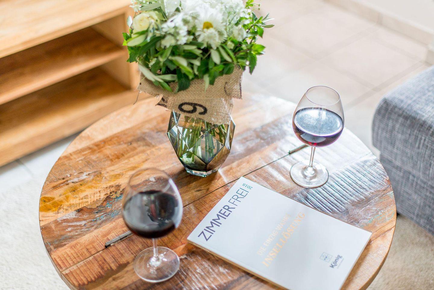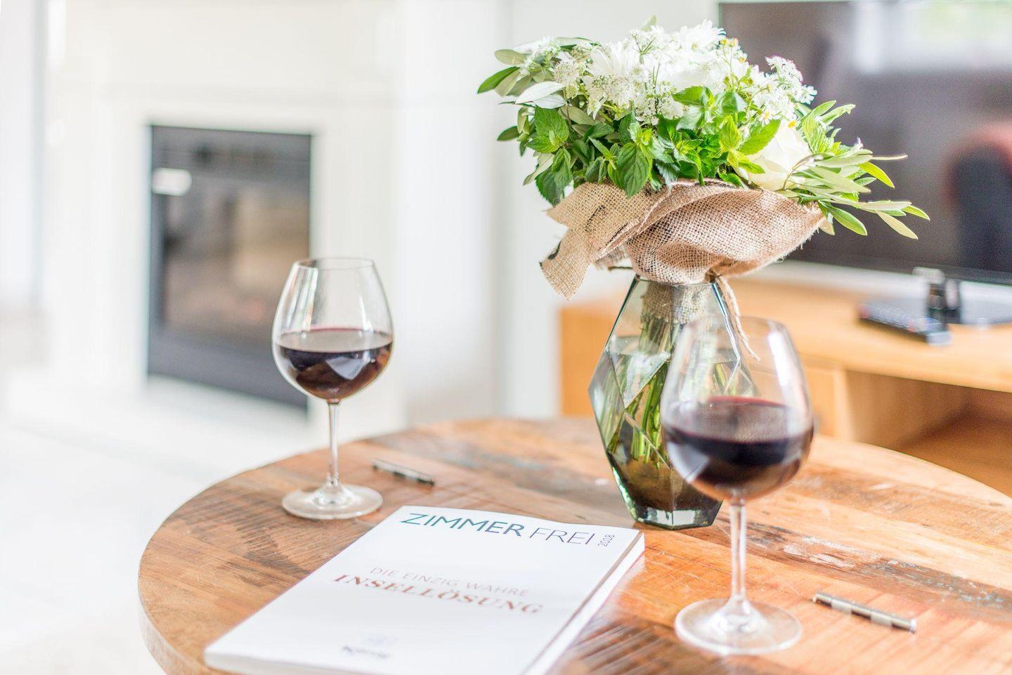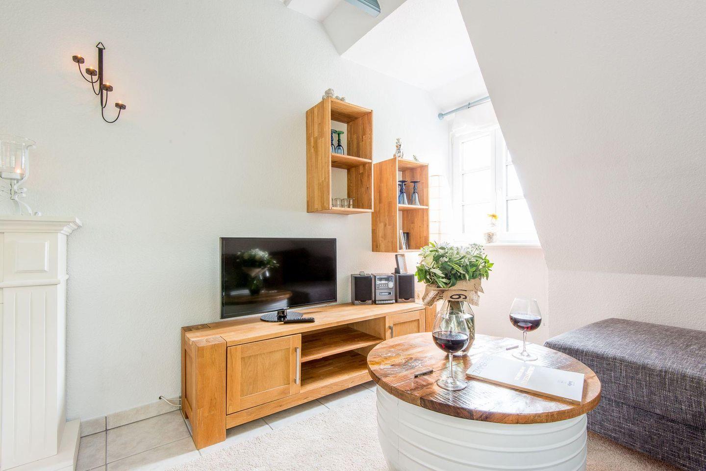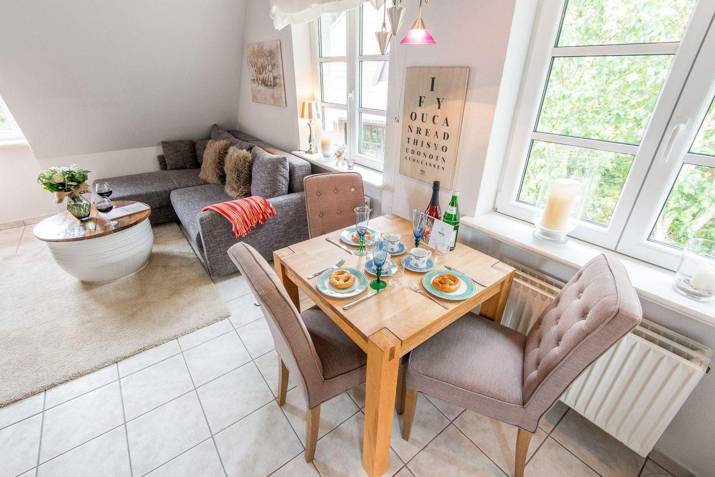 Der lichtdurchflutete Wohnbereich ist mit einem gemütlichen Sofa, einem Esstisch mit 3 Stühlen und einem TV ausgestattet. Vor dem Haus lädt der Sonnenfreisitz mit einem Strandkorb zum Entspannen und Genießen der frischen Seeluft ein.