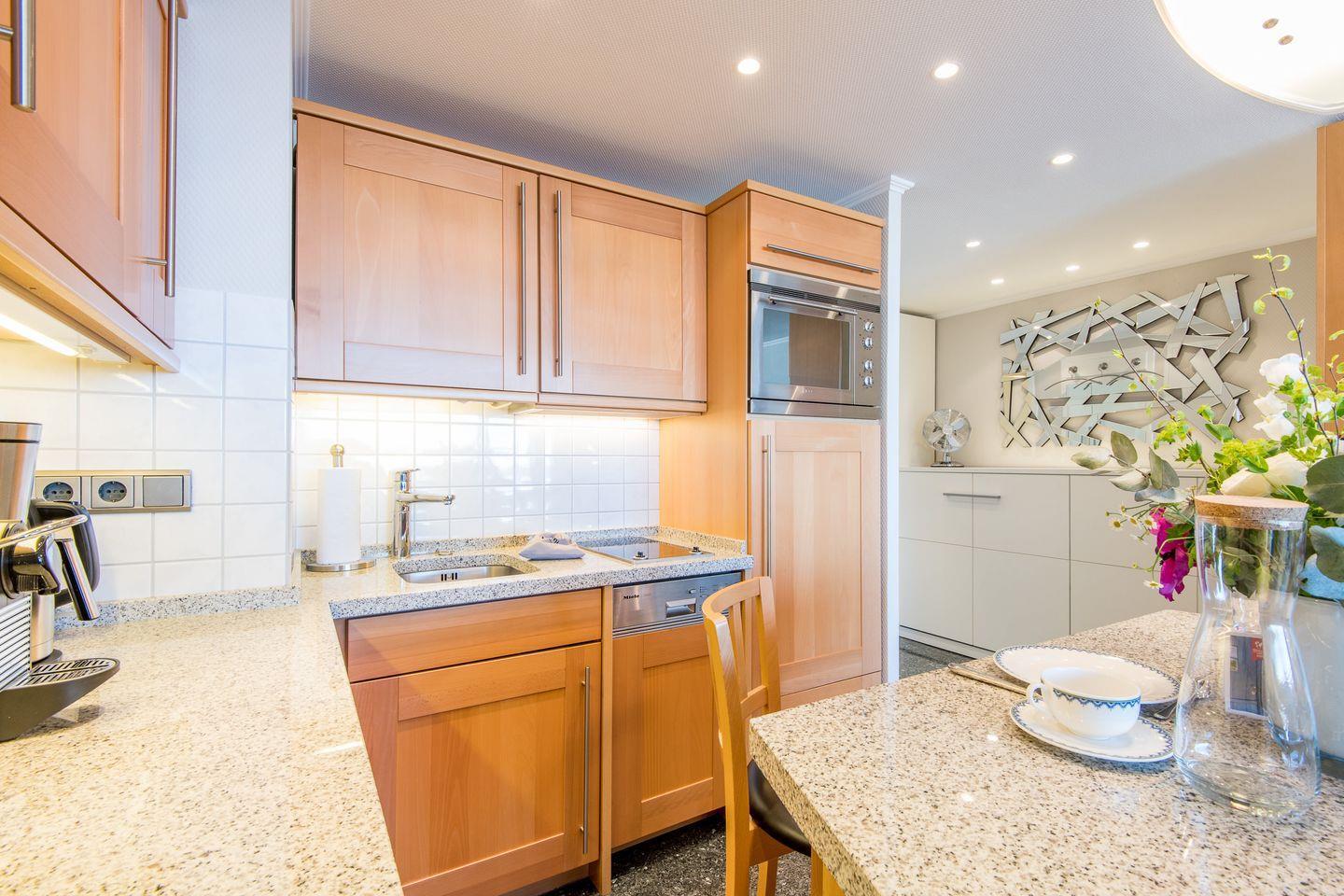 Die offene Einbauküche ist komplett ausgestattet und bietet jeden Komfort, darunter ein Cerankochfeld, eine Mikrowelle und einen Geschirrspüler.