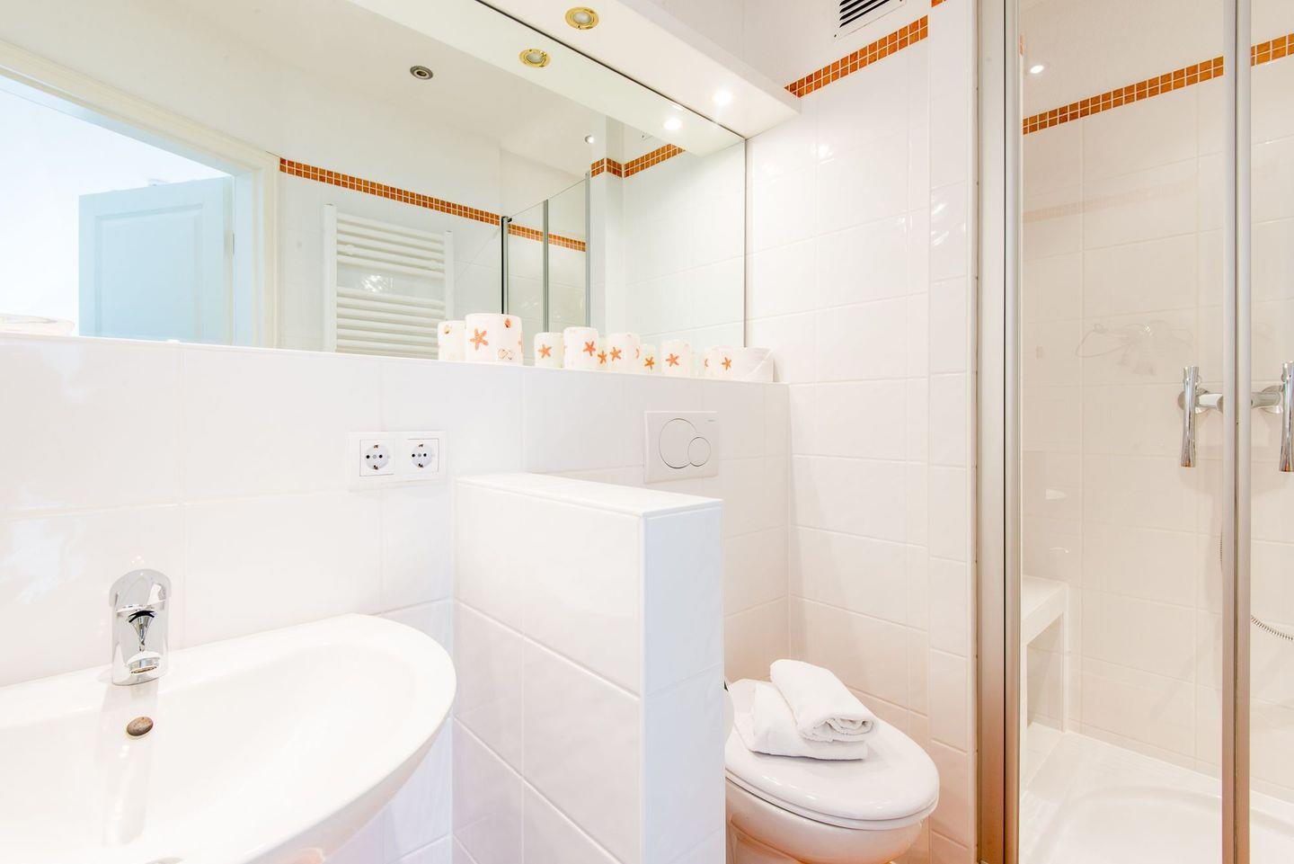 Die zwei Schlafzimmer sind komfortabel eingerichtet und bieten Ihnen eine erholsame Nachtruhe. Das Hauptschlafzimmer ist mit einem Doppelbett (2x 90x200 cm), TV und Kleiderschrank ausgestattet, während das zweite Schlafzimmer über zwei Einzelbetten (je 90x200 cm), TV und einen geräumigen Kleiderschrank verfügt. Zwei Badezimmer mit Dusche, WC und Fön bieten zusätzlichen Komfort und erleichtern den Start in den Tag.