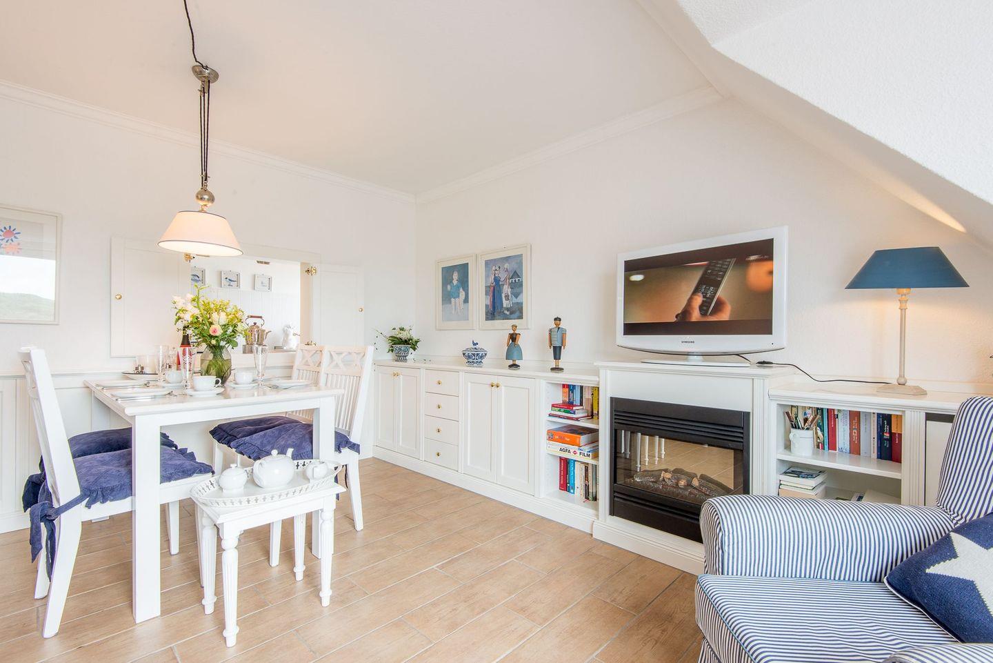 Der Wohn- und Essbereich der Wohnung ist komfortabel und gemütlich eingerichtet. Einladende Sitzgelegenheiten und ein Esstisch für 4 Personen bieten Raum für gemeinsame Mahlzeiten und erholsame Stunden. Vom Wohnzimmer aus gelangen Sie direkt auf den sonnigen Balkon, der zum Verweilen einlädt und den Blick über die Dünen freigibt.