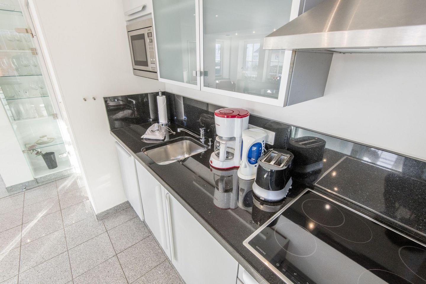 Die offene Küche ist voll ausgestattet und bietet allen Komfort, den Sie für die Zubereitung Ihrer Lieblingsspeisen benötigen. Mit Geschirrspüler und allem, was das Herz begehrt, ist sie ideal für alle, die auch im Urlaub gerne kochen. Hier können Sie Ihre Mahlzeiten in einer stilvollen und praktischen Umgebung genießen.