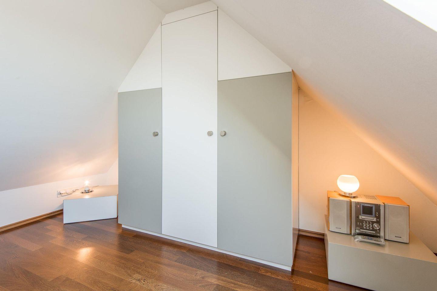 Das Schlafzimmer befindet sich auf der oberen Ebene und ist mit einem bequemen Doppelbett (2x 80x200 cm), einem Einbauschrank ausgestattet. Hier können Sie nach einem erlebnisreichen Tag zur Ruhe kommen und den Komfort der stilvollen Einrichtung genießen.