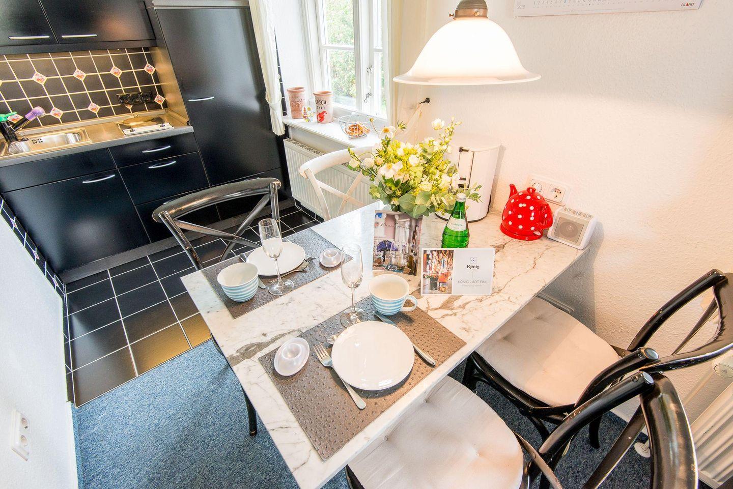 Die halboffene Küche ist funktional und stilvoll eingerichtet. Sie verfügt über einen 2-flammigen Herd und alle notwendigen Utensilien, um ein leckeres Frühstück oder kleine Mahlzeiten zuzubereiten. Der Esstisch bietet Platz für bis zu 4 Personen, perfekt für ein gemütliches Essen oder eine Tasse Tee am Nachmittag.
