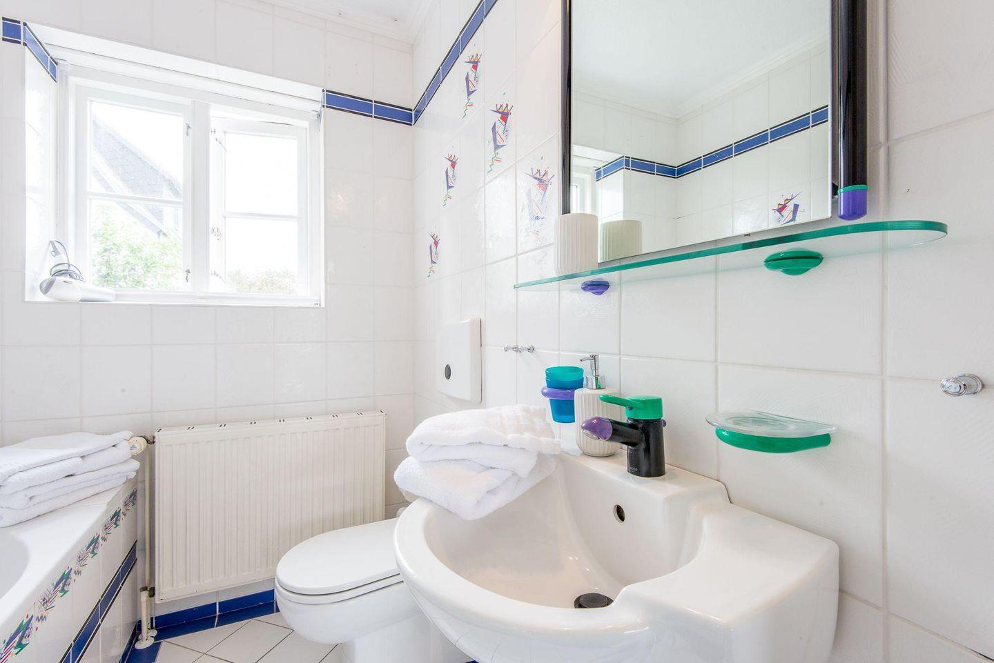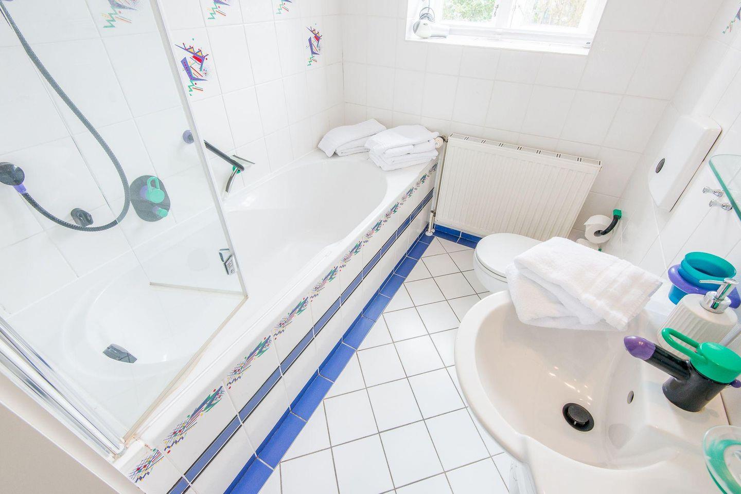 Das Badezimmer ist hell und freundlich gestaltet. Es verfügt über eine Badewanne, ein WC und einen Föhn. Dank des Tageslichts wird das Badezimmer zu einem einladenden Ort, um den Tag frisch zu beginnen.