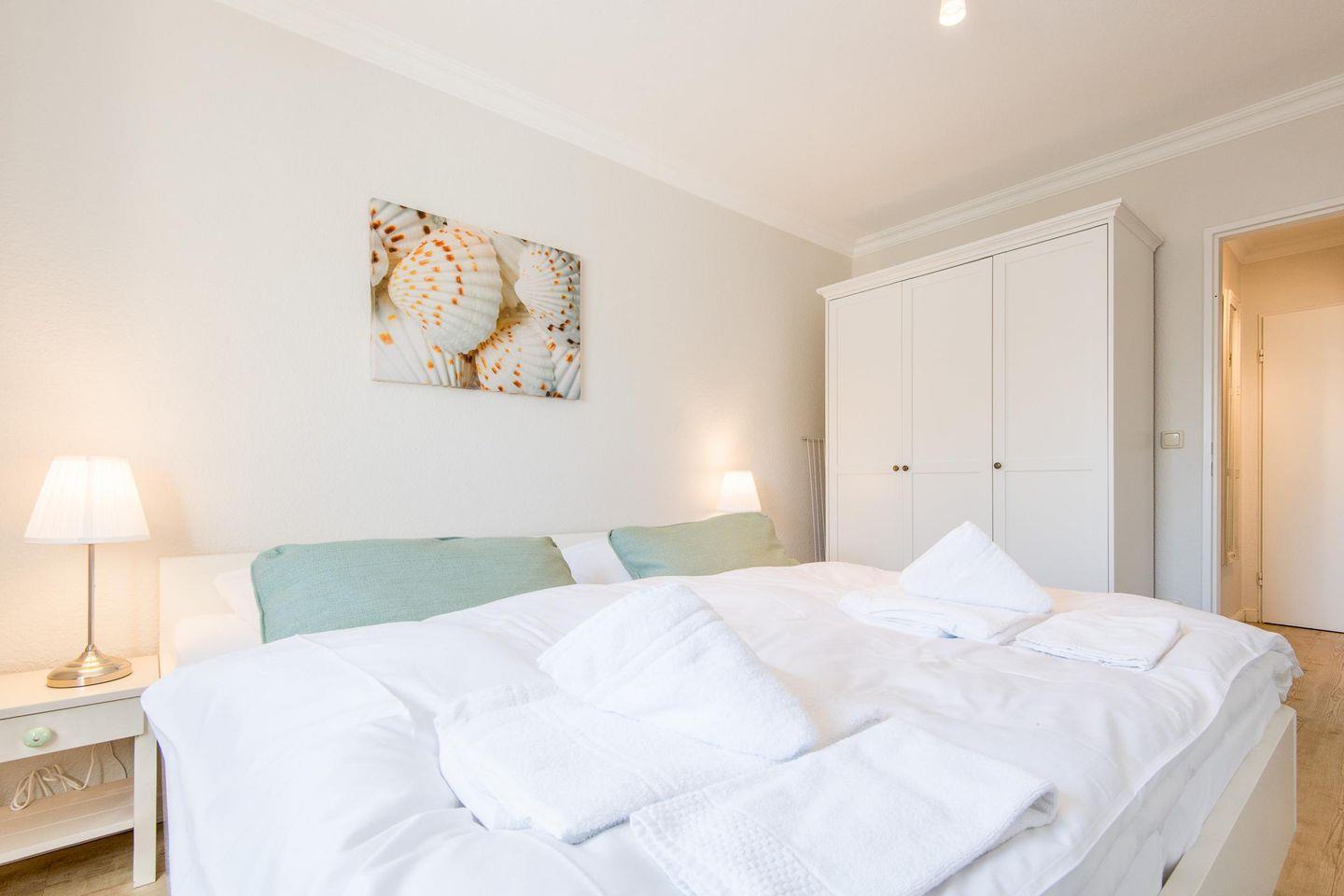 Das Schlafzimmer bietet ein komfortables Doppelbett (2x 90x200 cm) und einen geräumigen Kleiderschrank, der genügend Stauraum für Ihre Garderobe während des Aufenthalts bietet. Hier können Sie sich nach einem erlebnisreichen Tag entspannen und erholsamen Schlaf finden.