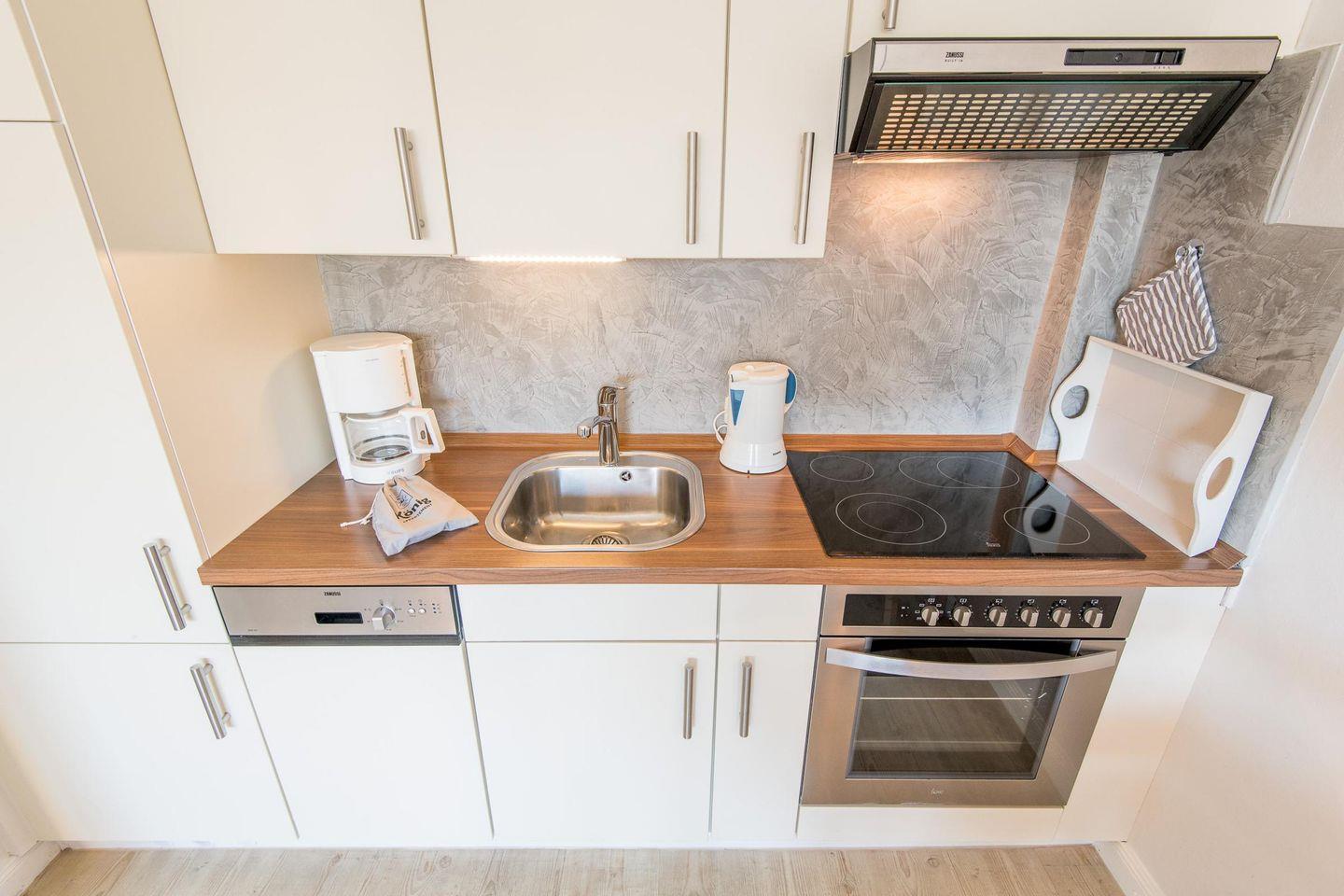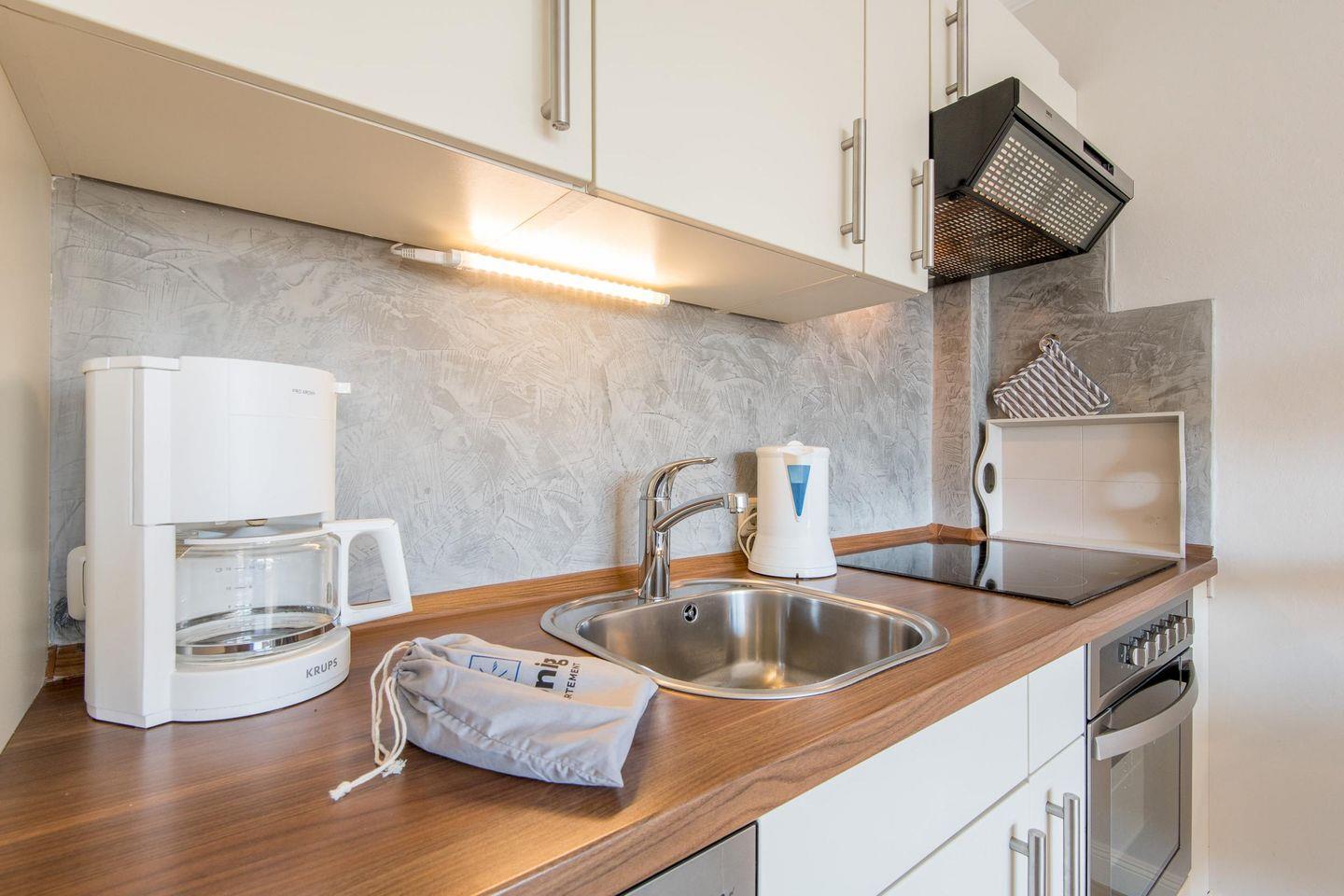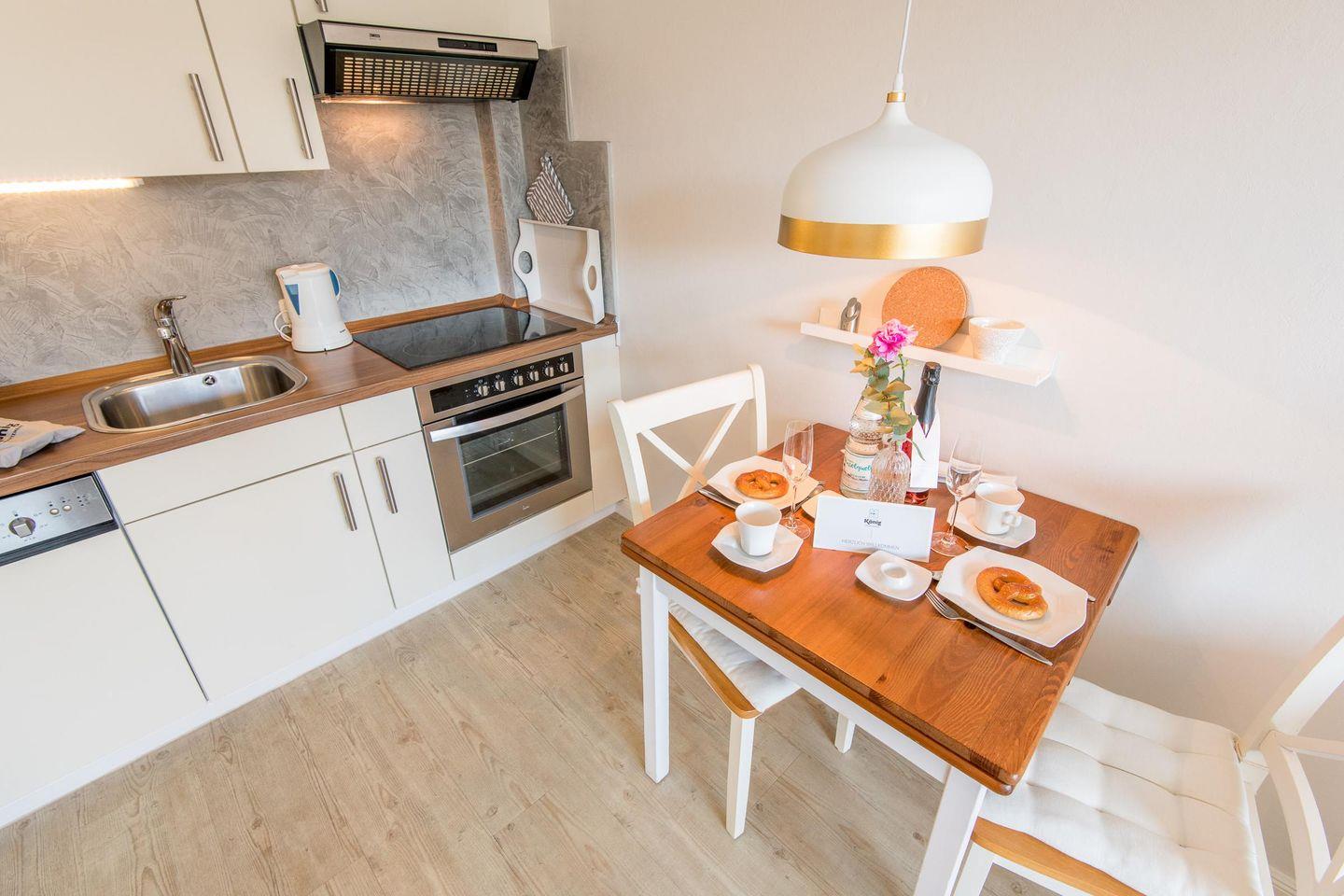 Die offene Küche ist modern ausgestattet und verfügt über ein 4-Platten-Cerankochfeld sowie alle notwendigen Utensilien, um sich kulinarisch zu entfalten. Ob Sie ein ausgiebiges Frühstück oder ein Abendessen zaubern möchten – hier finden Sie alles, was Sie brauchen.