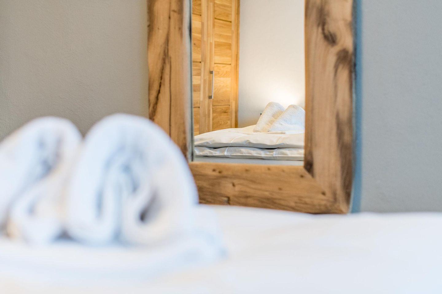 Das moderne Badezimmer verfügt über eine Dusche, ein WC, einen Handtuchwärmer und einen Föhn. Die hochwertige Ausstattung sorgt für einen angenehmen Start in den Tag.