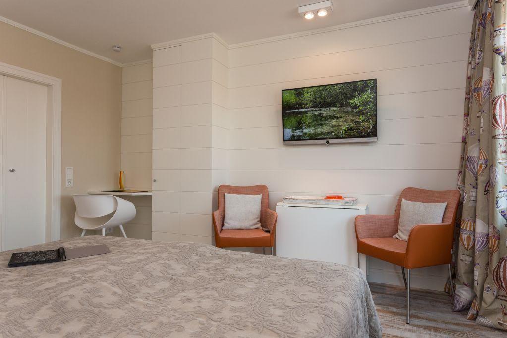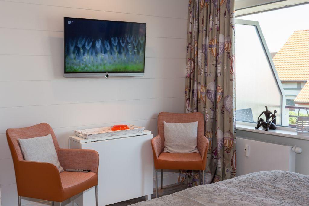 Der moderne Wohn- und Schlafbereich ist mit einem komfortablen Doppelbett (160x200 cm, Boxspring mit Taschenfederkern) ausgestattet, das Ihnen erholsame Nächte garantiert. Hochwertige Einrichtungselemente wie Sessel von Bert Plantagie, Dekoration von Manuel Canovas und maßgefertigte Tischlereinbauten verleihen dem Raum eine exklusive Note. Für Ihre Unterhaltung sorgen ein großer Loewe TV, eine Hifi-Anlage sowie eine kleine Bibliothek und ein Schachspiel – ideal für gemütliche Tage, an denen Sie sich lieber "zuhause" entspannen möchten.