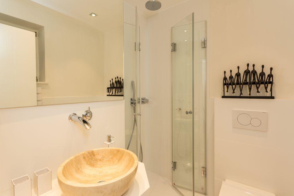 Das stilvolle Badezimmer ist mit einer komfortablen (Regen-) Dusche, hochwertigen Design-Armaturen, einem WC, einem Handtuchwärmer und einem Föhn ausgestattet. Diese angenehme Atmosphäre macht das Badezimmer zu einem Ort der Erholung.