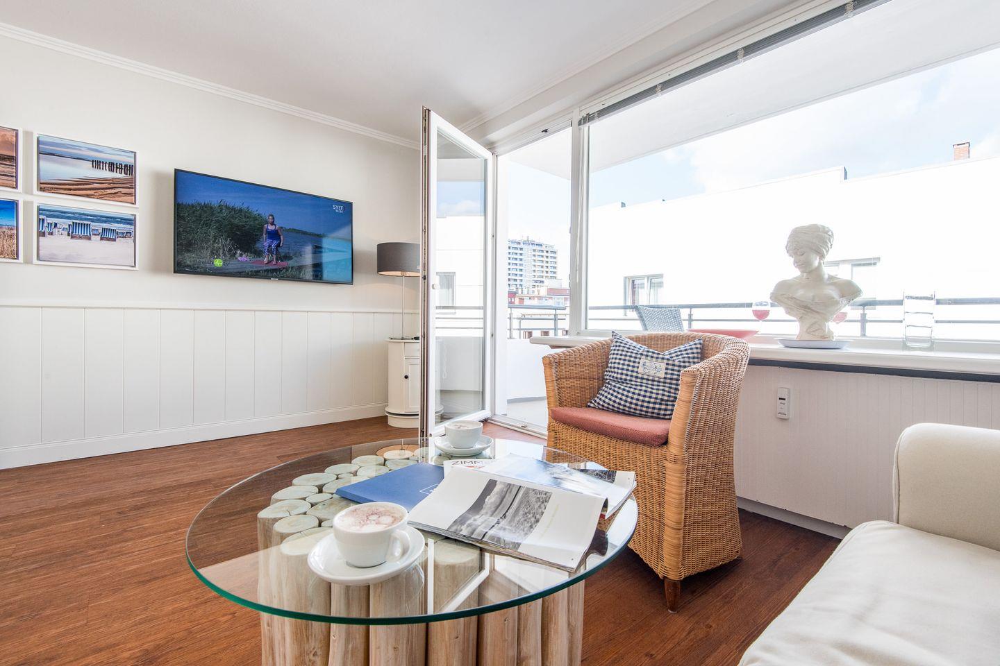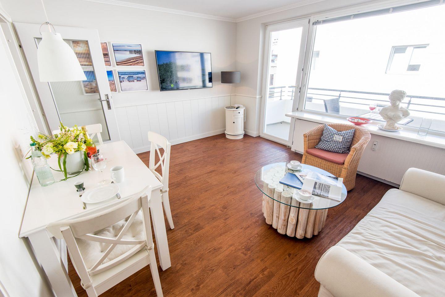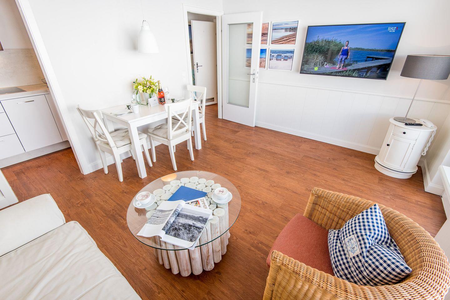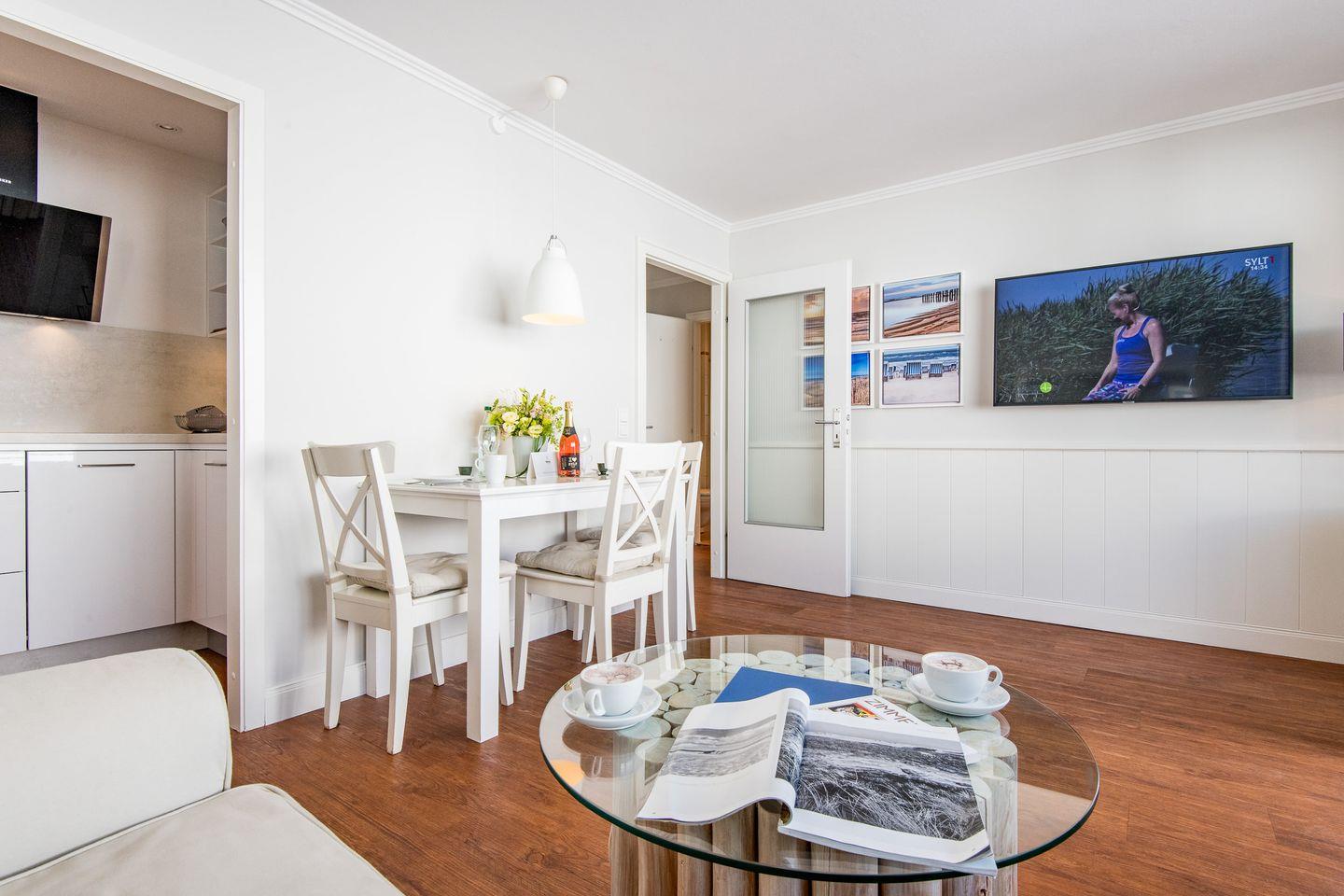 Der helle Wohnbereich ist mit einer bequemen Couch, einem Sessel, einem Esstisch und einem TV ausgestattet. An den Wänden finden sich Werke des bekannten Sylt-Fotografen Widera, die dem Raum eine besondere Atmosphäre verleihen. Der Balkon nach Nordosten bietet einen ruhigen Platz, um die frische Luft zu genießen.