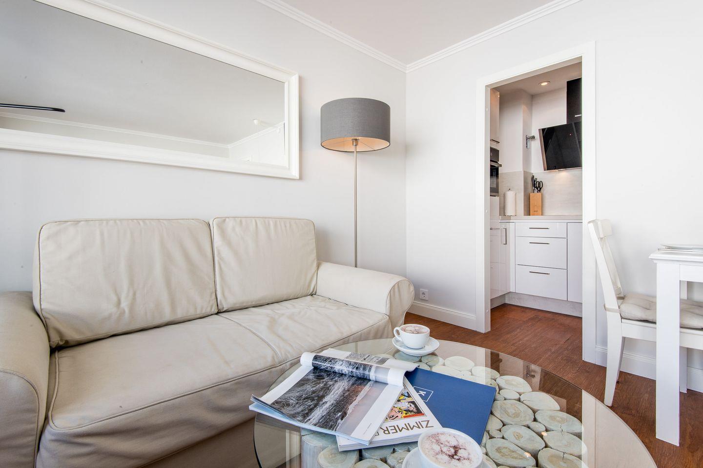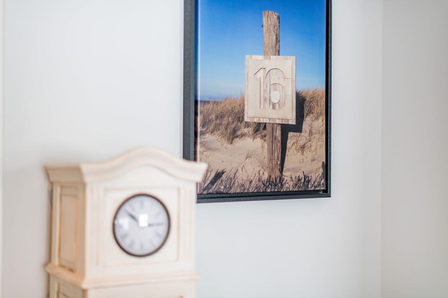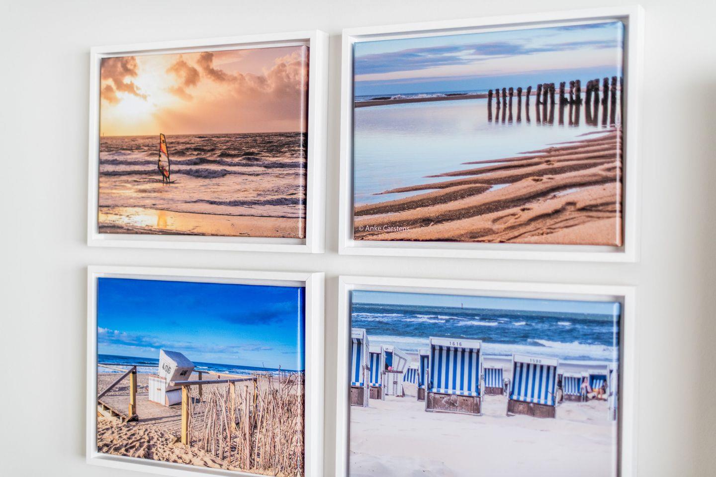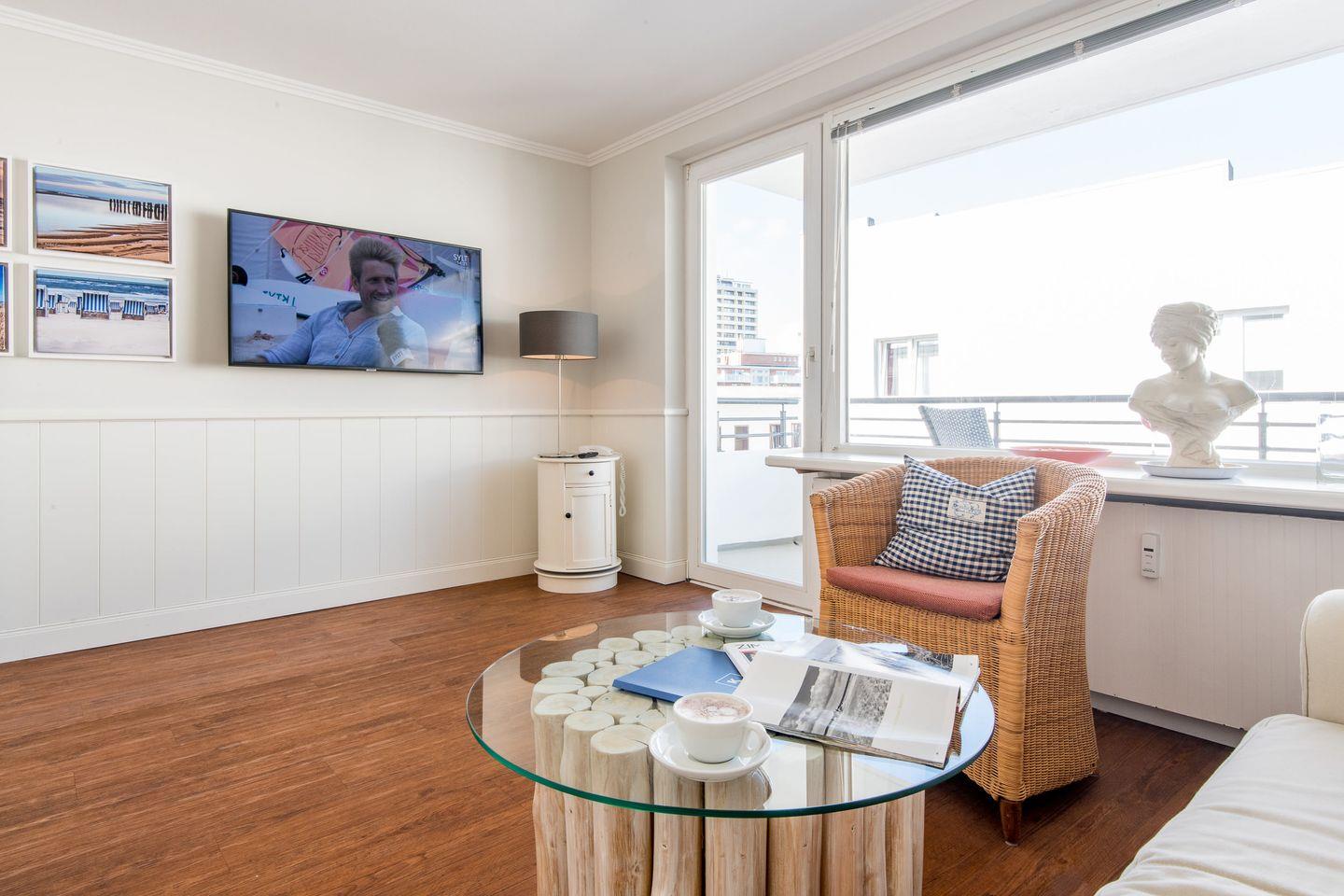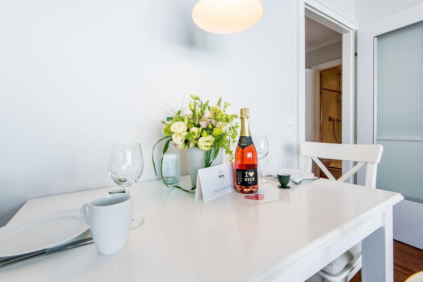 Der helle Wohnbereich ist mit einer bequemen Couch, einem Sessel, einem Esstisch und einem TV ausgestattet. An den Wänden finden sich Werke des bekannten Sylt-Fotografen Widera, die dem Raum eine besondere Atmosphäre verleihen. Der Balkon nach Nordosten bietet einen ruhigen Platz, um die frische Luft zu genießen.
