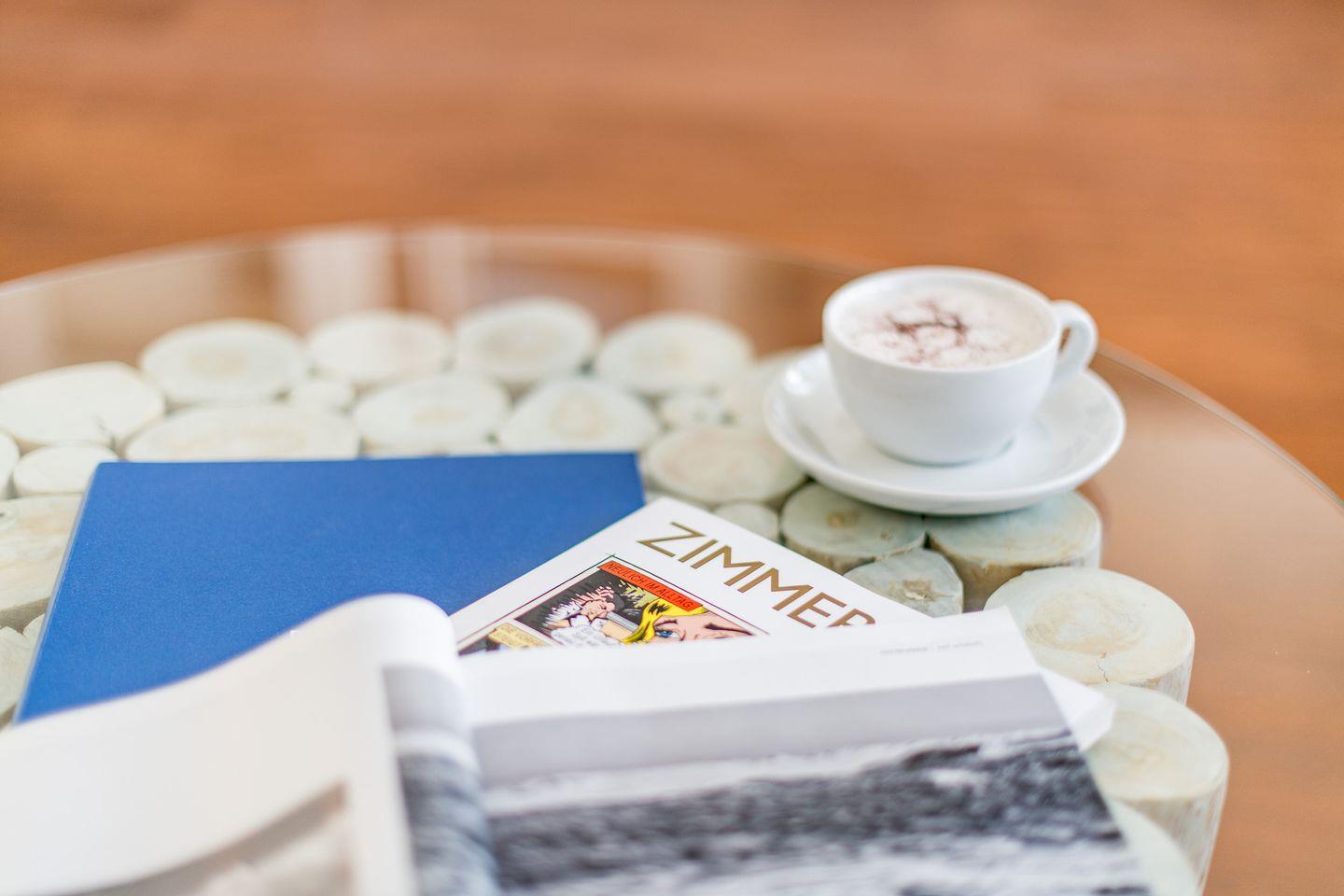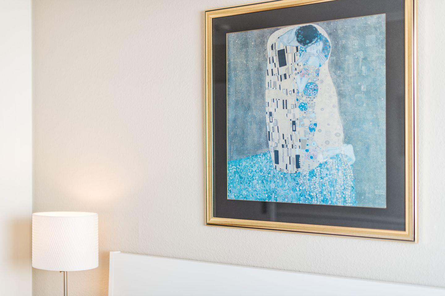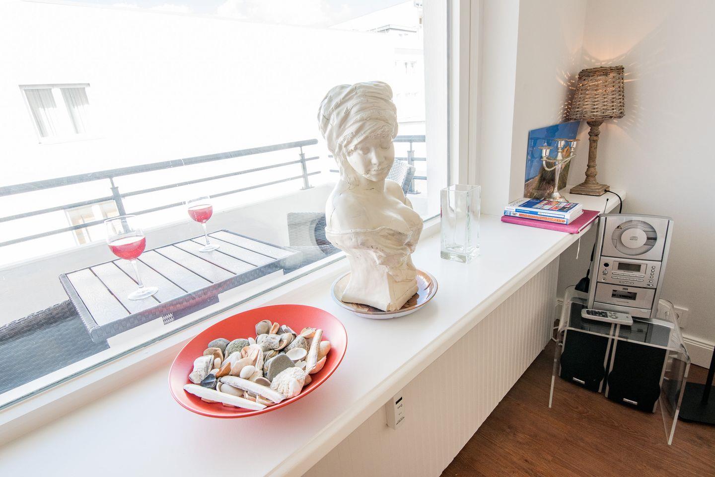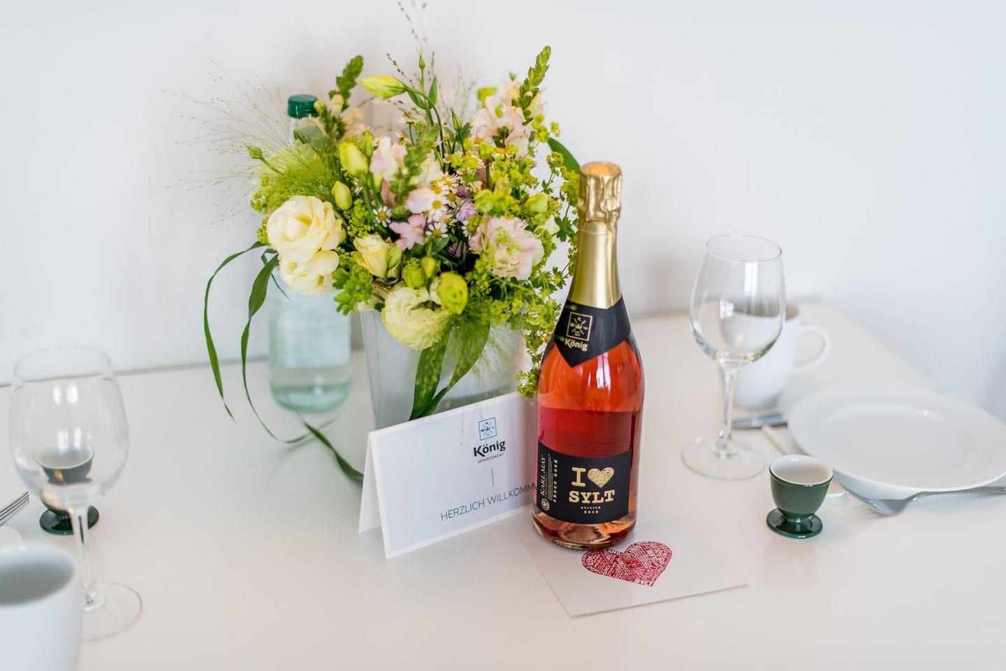 Der helle Wohnbereich ist mit einer bequemen Couch, einem Sessel, einem Esstisch und einem TV ausgestattet. An den Wänden finden sich Werke des bekannten Sylt-Fotografen Widera, die dem Raum eine besondere Atmosphäre verleihen. Der Balkon nach Nordosten bietet einen ruhigen Platz, um die frische Luft zu genießen.