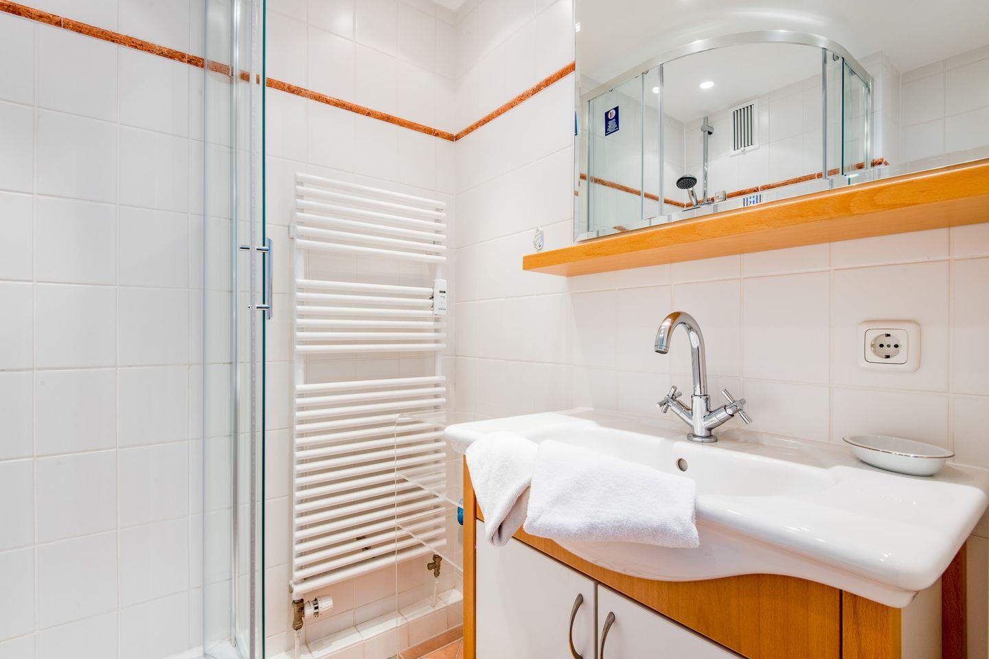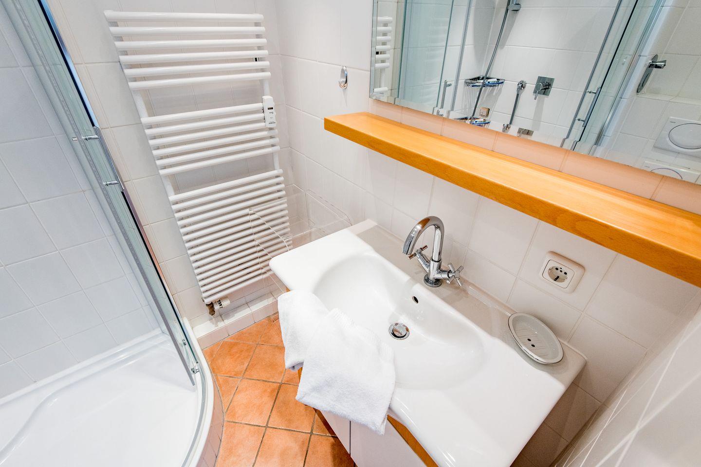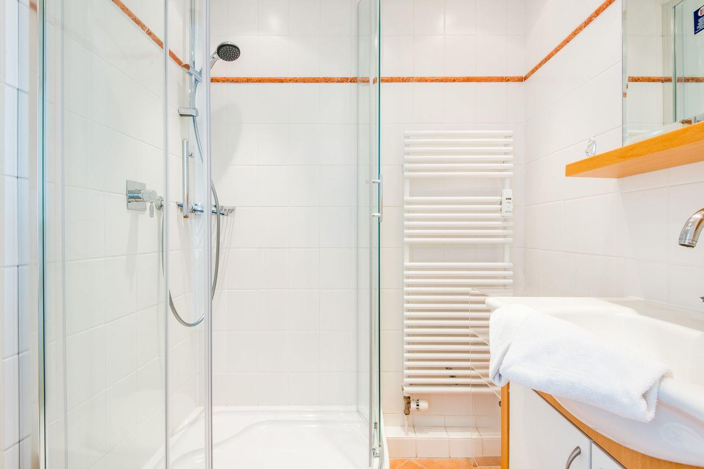 Das Badezimmer verfügt über eine Dusche, ein WC und einen Handtuchwärmer – ideal für einen frischen Start in den Tag.