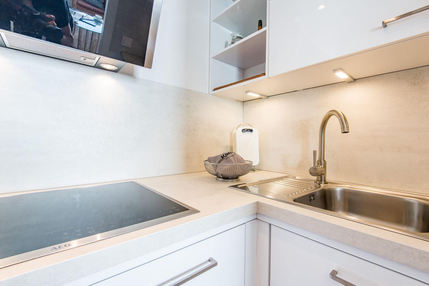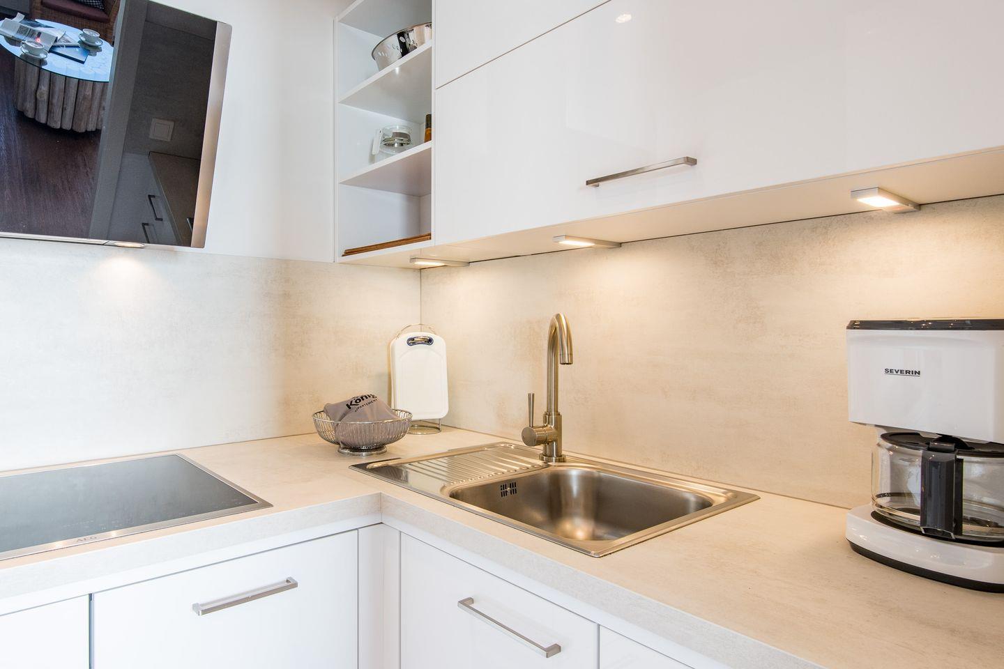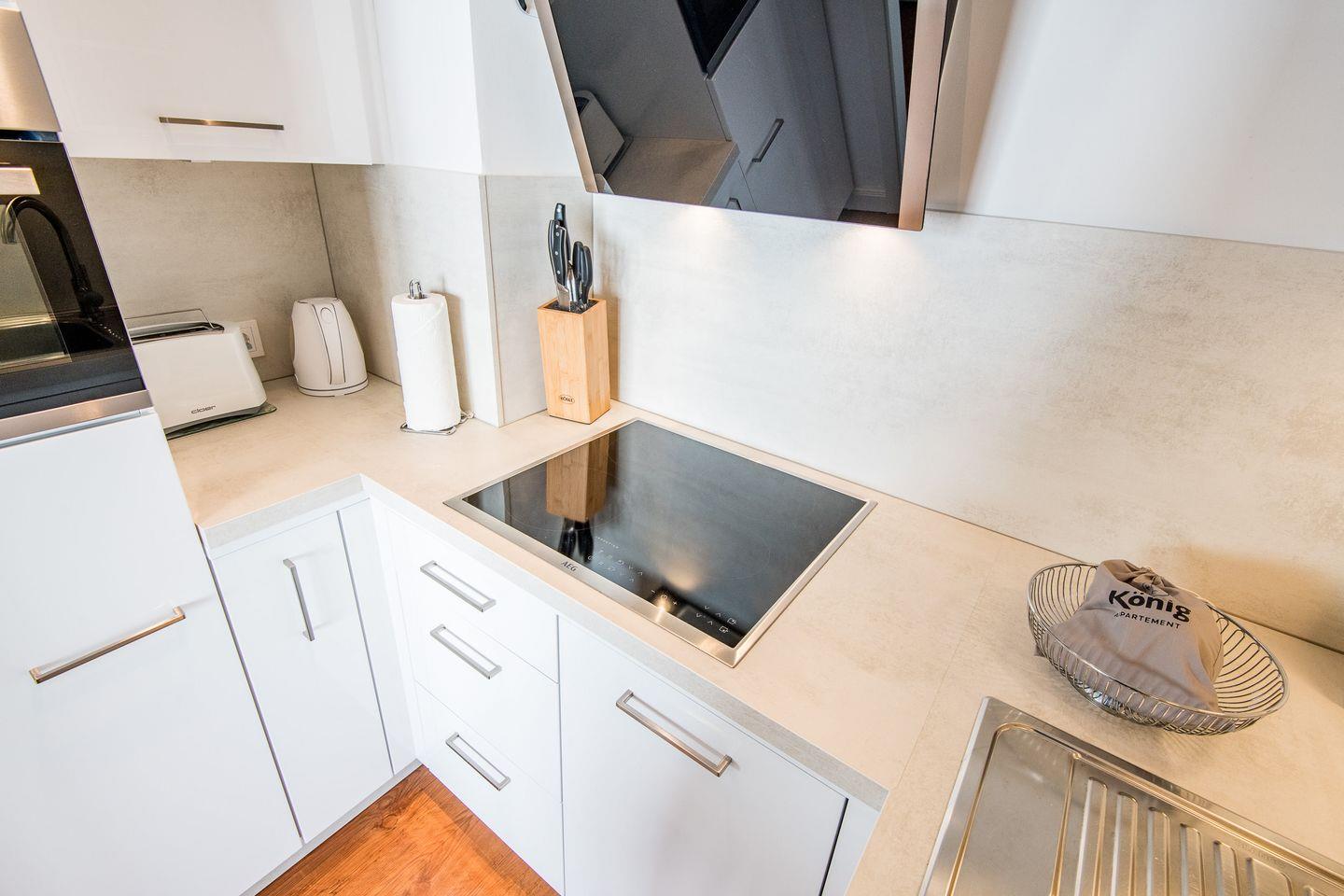 Die offene Küche ist mit modernen Geräten ausgestattet, darunter ein Induktionsherd, ein Backofen, eine Mikrowelle und ein Geschirrspüler. Hier finden Sie alles, was Sie für die Zubereitung Ihrer Mahlzeiten benötigen.