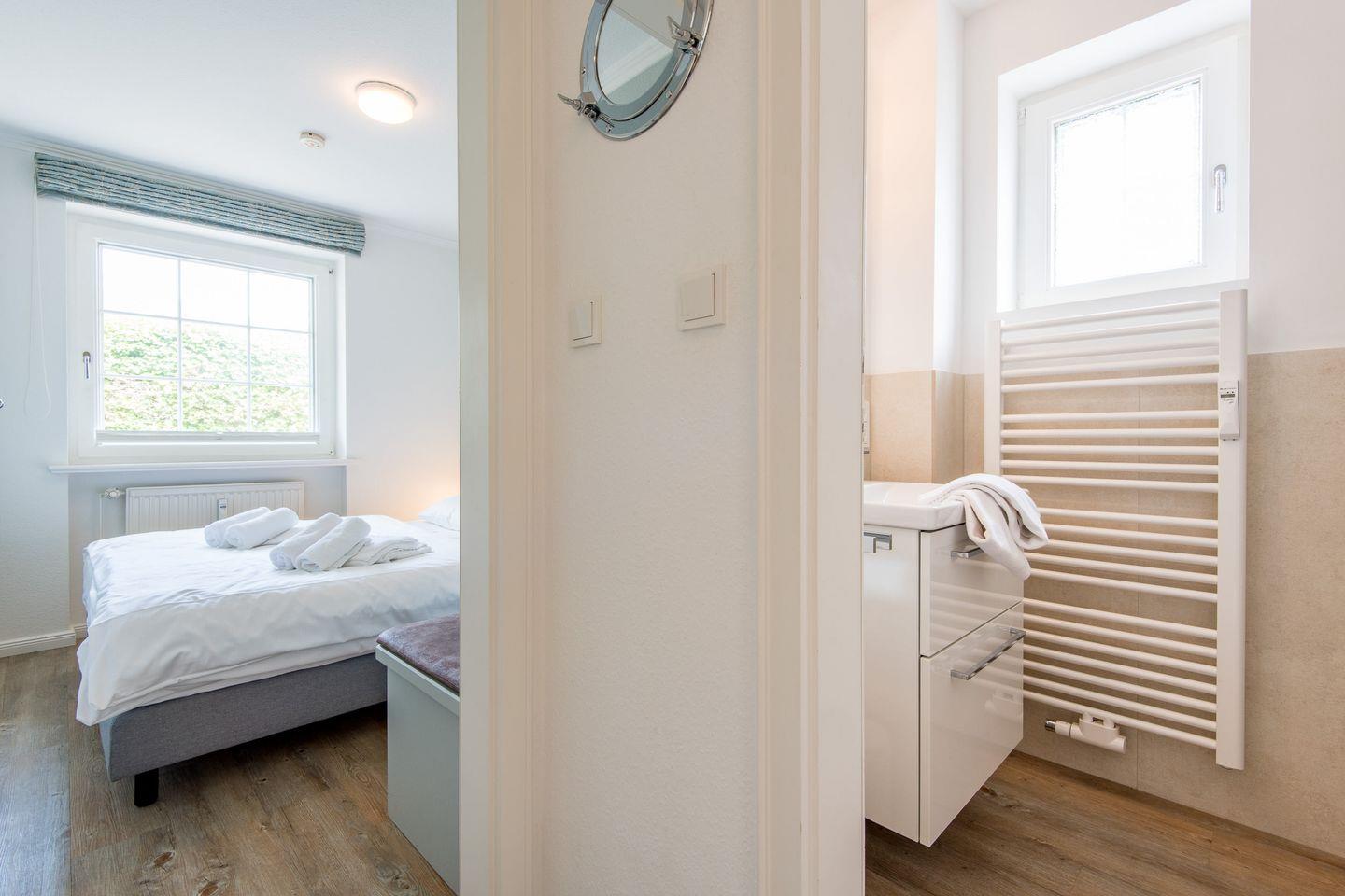 Das Badezimmer verfügt über eine Dusche, WC, Handtuchwärmer und Tageslicht – ideal für ein erfrischendes Duscherlebnis nach einem erholsamen Strandtag.