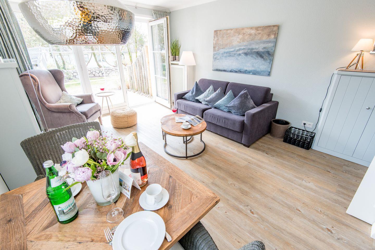 Das stilvolle Wohnzimmer ist mit einem gemütlichen Sofa und einem bequemen Sessel ausgestattet. Ein großer TV mit Media Receiver und Netflix Zugang sowie eine Bose Soundanlage sorgen für entspannte Stunden. Der Esstisch für 2 Personen und die hochwertigen Tischlereinbauten runden das stimmige Wohnkonzept ab. Vom Wohnzimmer aus haben Sie direkten Zugang zur möblierten Gartenterrasse nach Süden, die mit einem Strandkorb ausgestattet ist und Erholung an der frischen Nordseeluft verspricht.