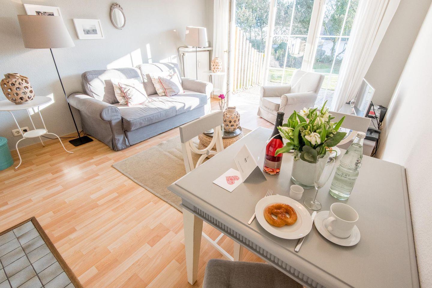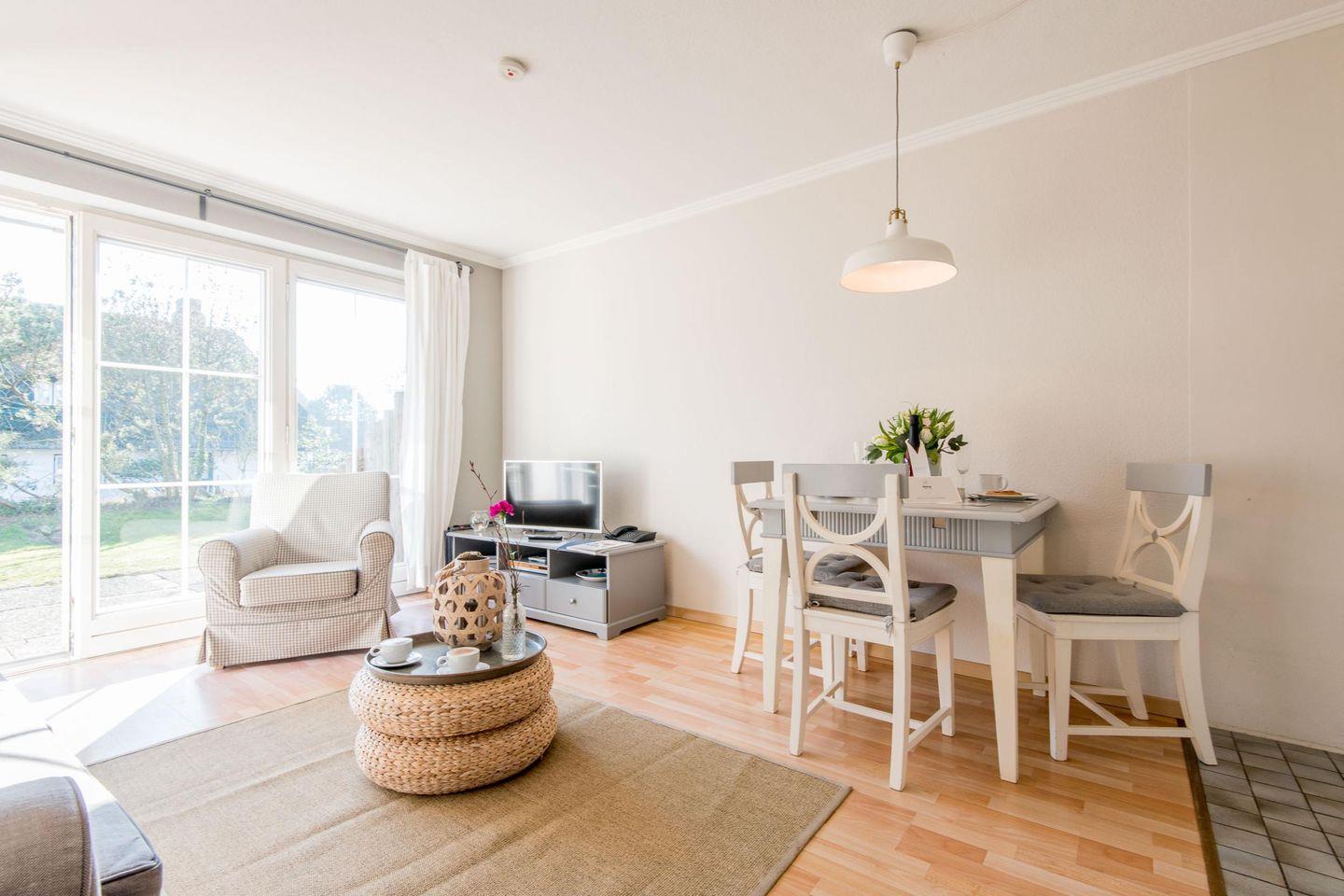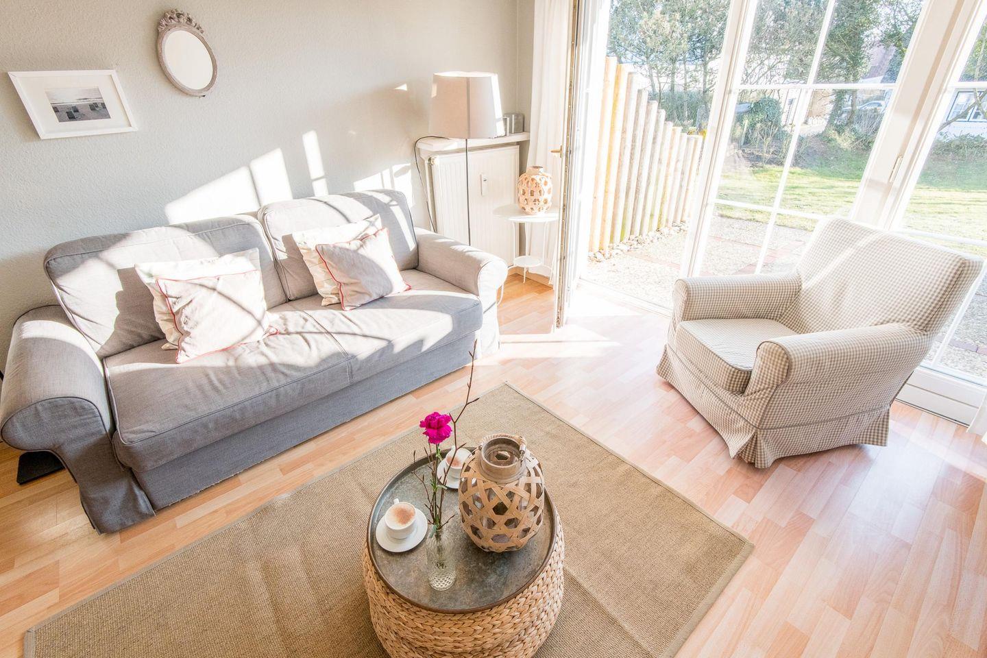 Das gemütliche Wohnzimmer ist mit einem ausziehbaren Schlafsofa (150x200 cm), einem Sessel und einem TV ausgestattet. Ein Esstisch mit 4 Stühlen ergänzt das Ensemble und sorgt für eine angenehme Atmosphäre. Vom Wohnzimmer haben Sie direkten Zugang zur möblierten Gartenterrasse nach Süden, die mit einem Strandkorb ausgestattet ist – ideal zum Entspannen an der frischen Luft.