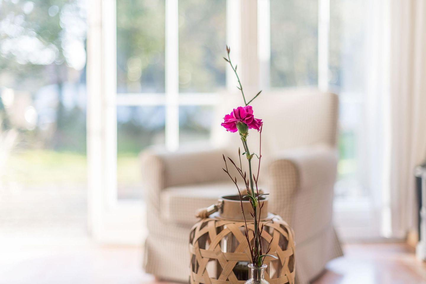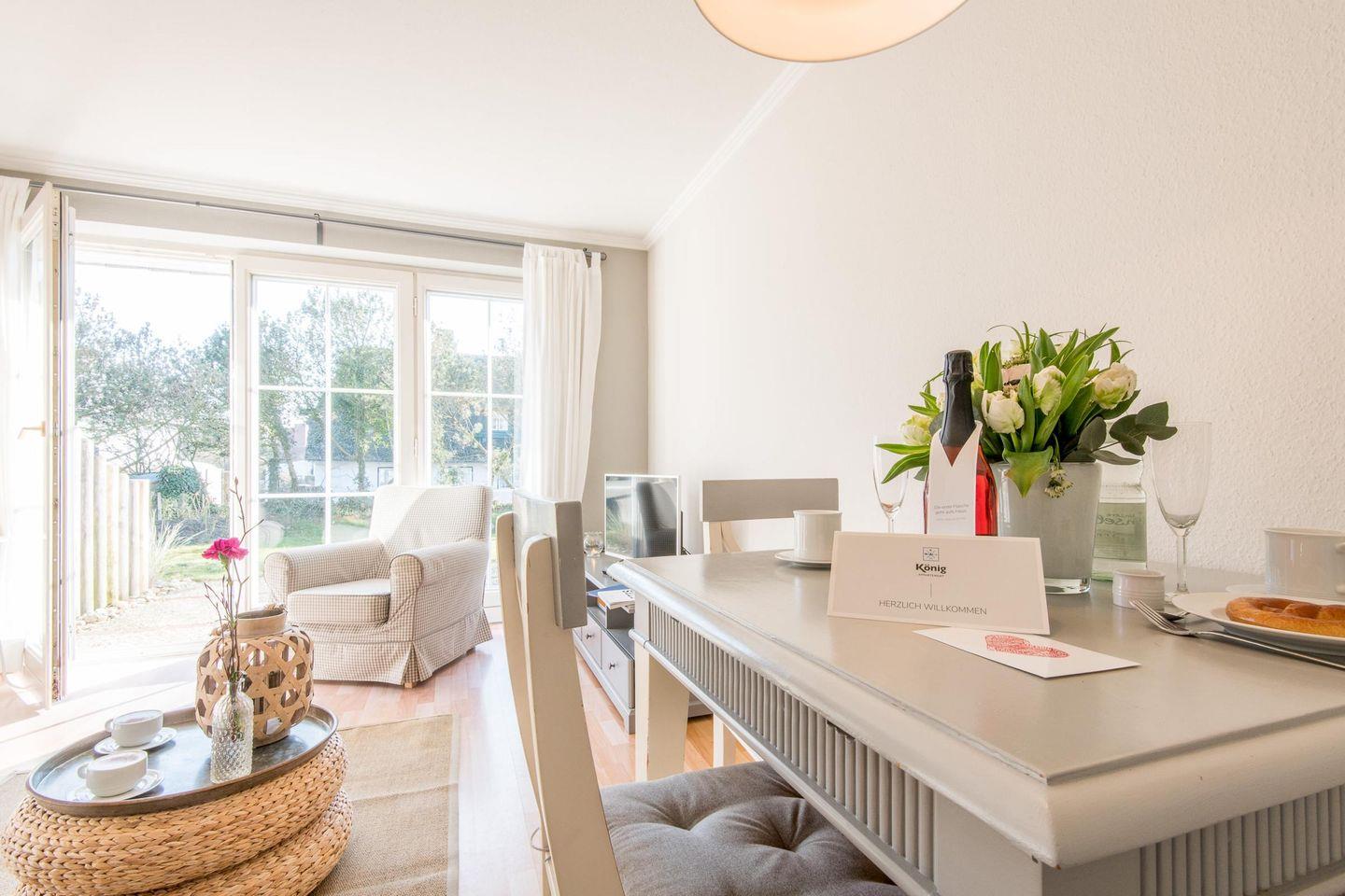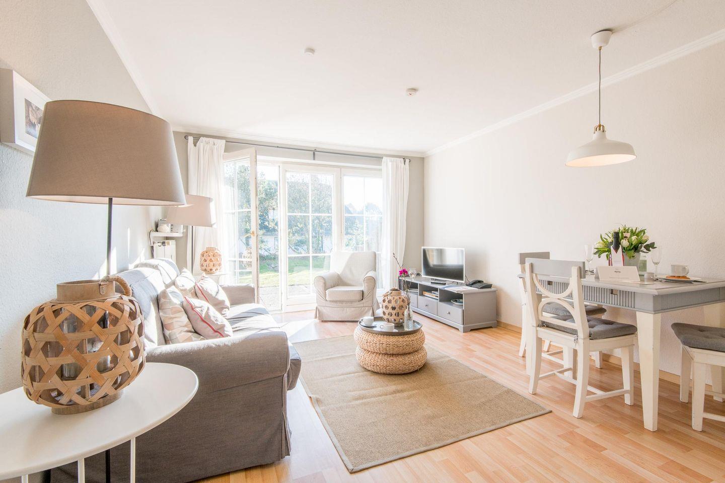 Das gemütliche Wohnzimmer ist mit einem ausziehbaren Schlafsofa (150x200 cm), einem Sessel und einem TV ausgestattet. Ein Esstisch mit 4 Stühlen ergänzt das Ensemble und sorgt für eine angenehme Atmosphäre. Vom Wohnzimmer haben Sie direkten Zugang zur möblierten Gartenterrasse nach Süden, die mit einem Strandkorb ausgestattet ist – ideal zum Entspannen an der frischen Luft.