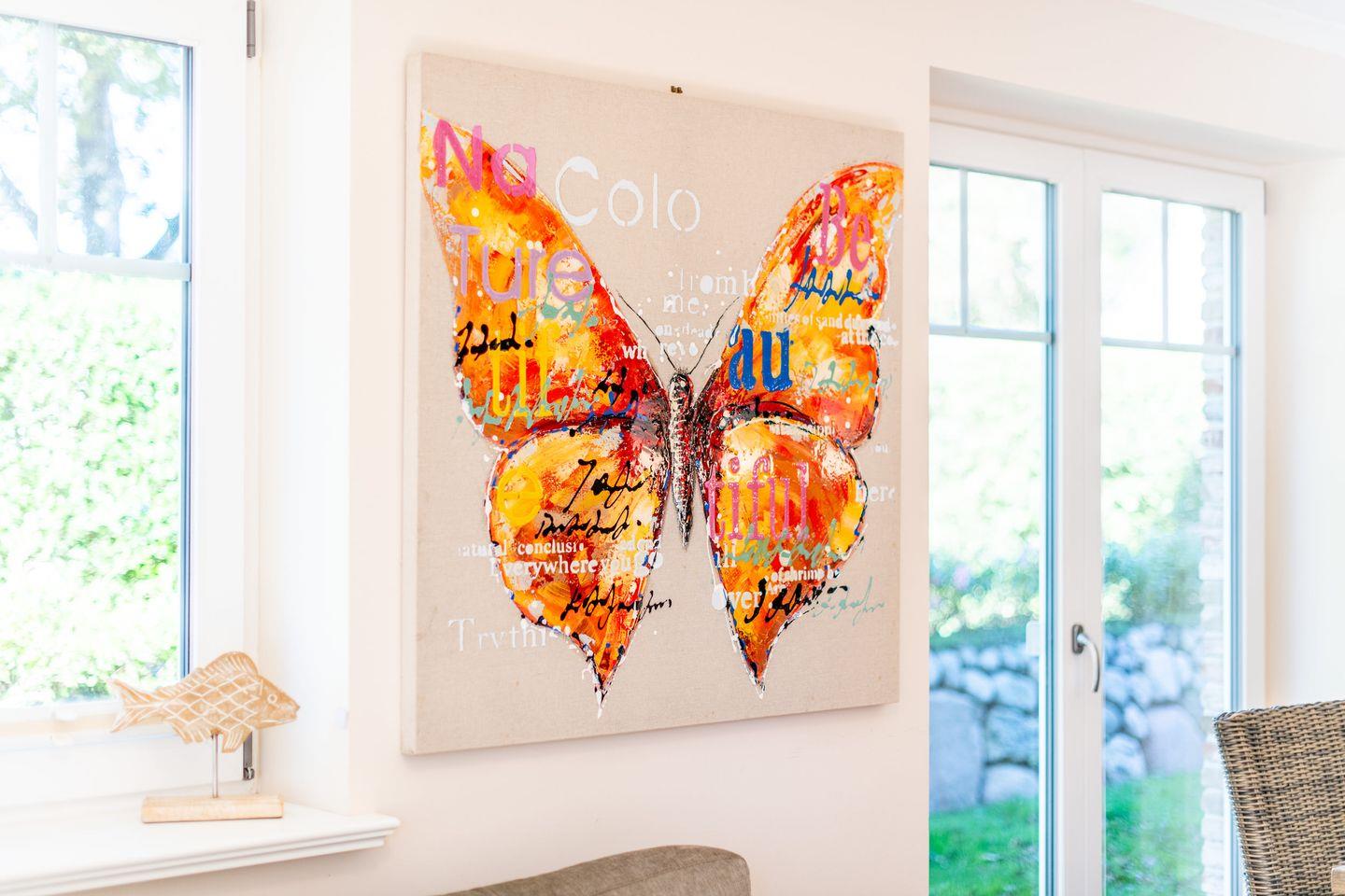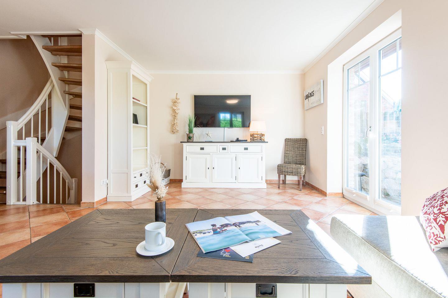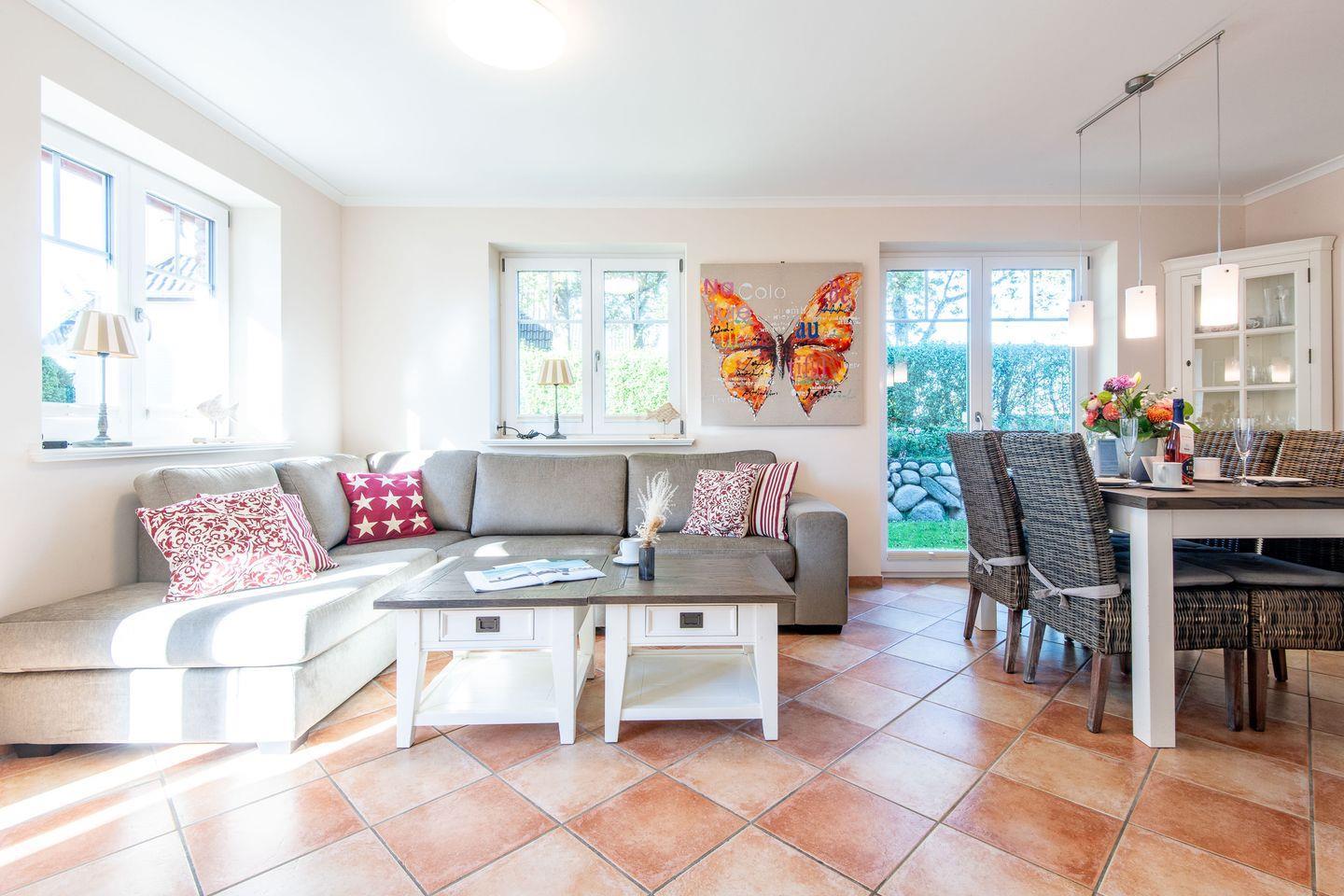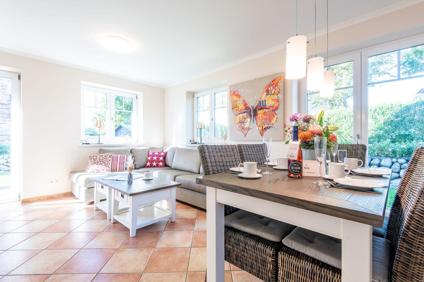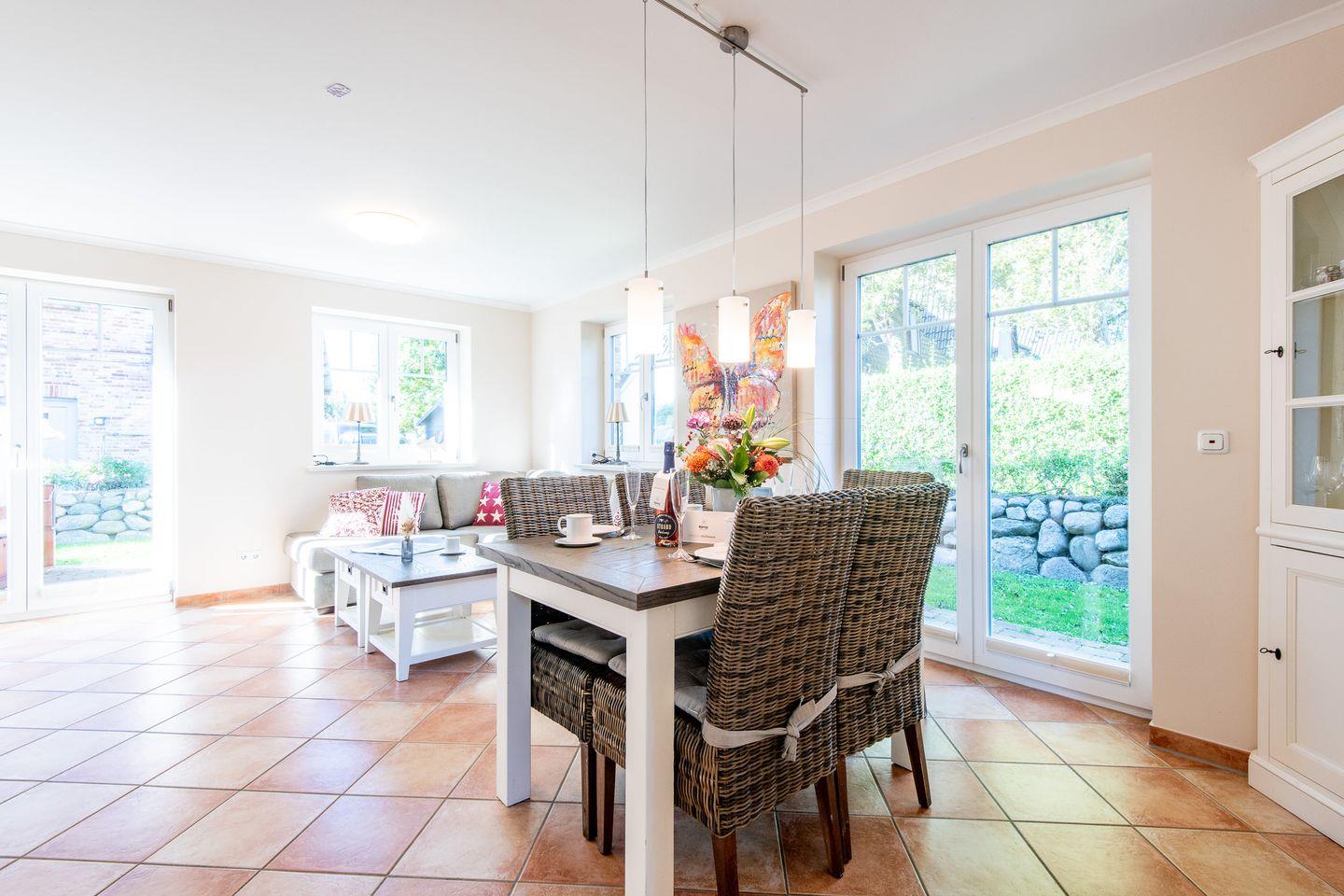 Das helle Wohnzimmer mit einem gemütlichen Ecksofa und einem TV lädt zum Verweilen ein. Der angrenzende Essbereich bietet Platz für bis zu 6 Personen. Von hier aus haben Sie direkten Zugang zur möblierten Süd-Terrasse mit einem Strandkorb, wo Sie sonnige Stunden im Garten genießen können.