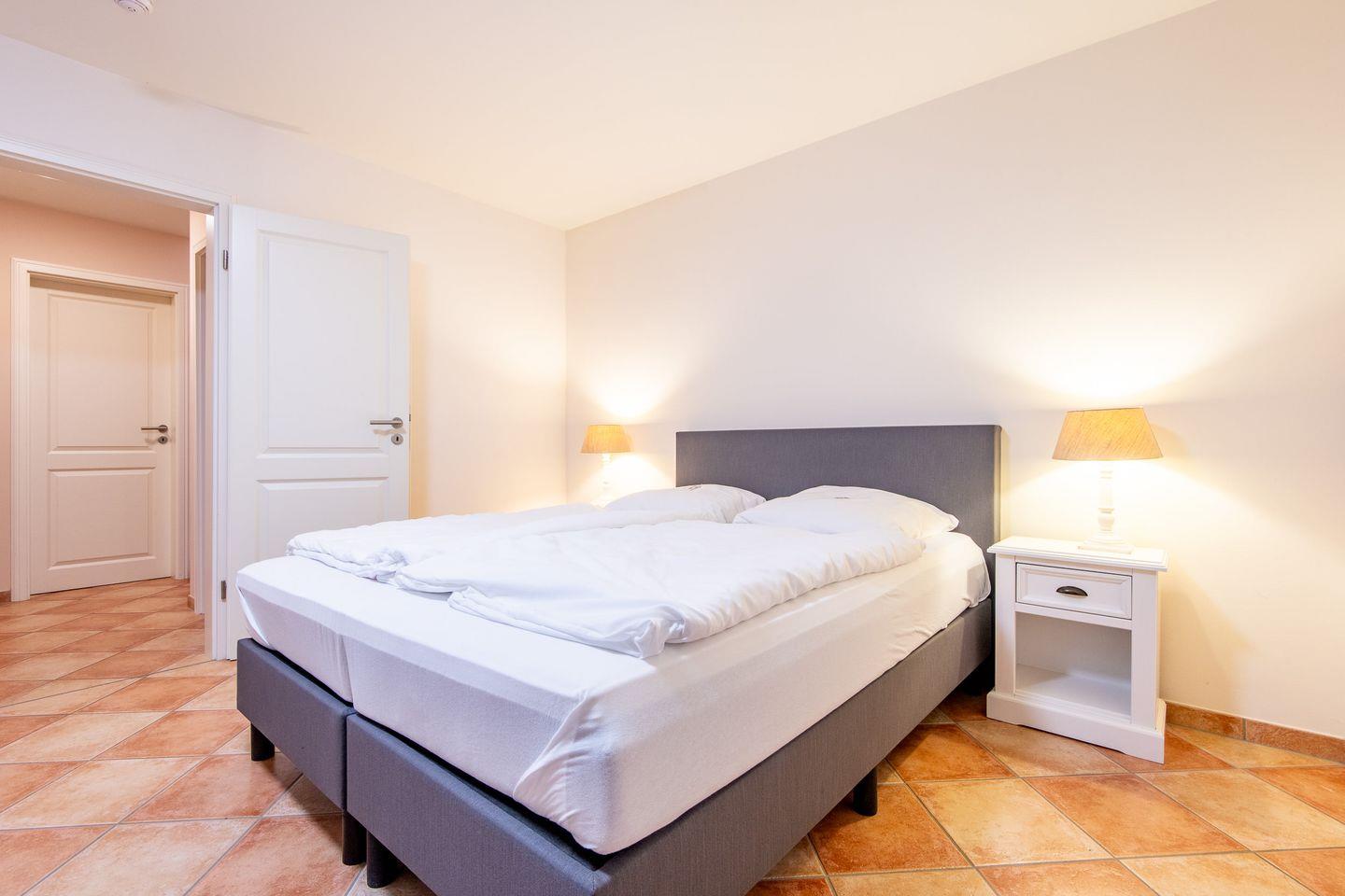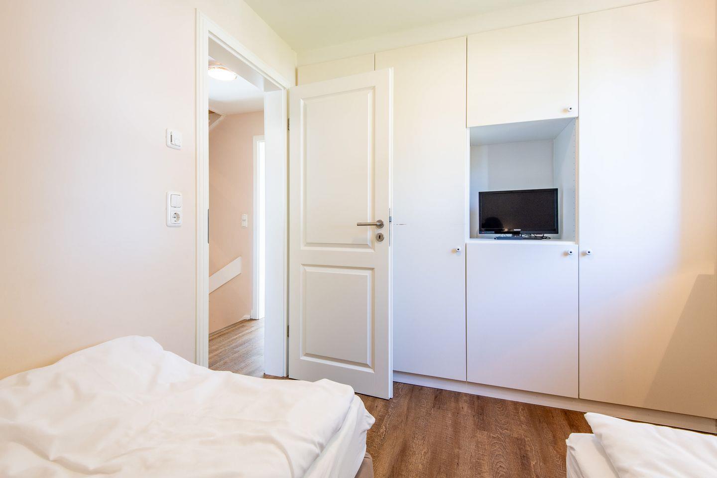 Das Haus verfügt über drei komfortable Schlafzimmer. Zwei der Schlafzimmer sind mit Doppelbetten (90x200 cm bzw. 80x200 cm), Kleiderschränken und TV ausgestattet, während das dritte Schlafzimmer zwei Einzelbetten (80x200 cm) bietet. Alle Räume sind geschmackvoll eingerichtet und bieten ausreichend Stauraum.