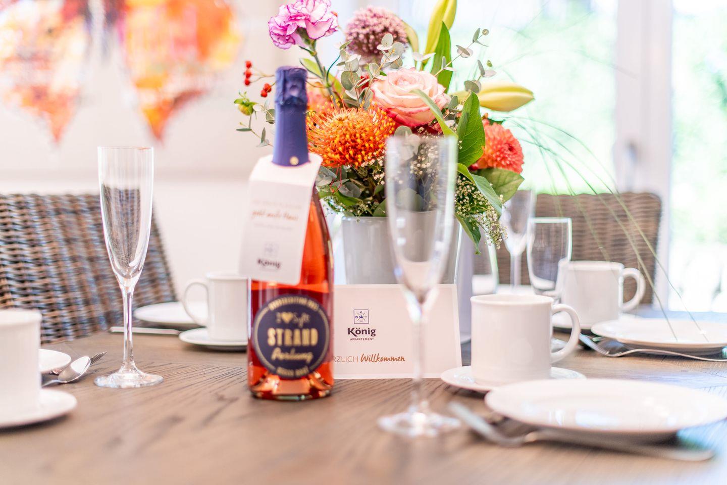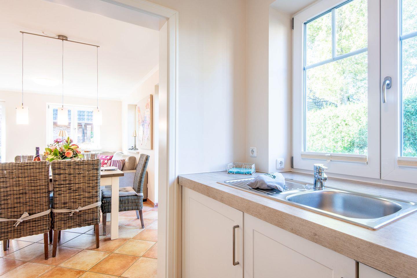 Die moderne, offene Küche ist vollständig ausgestattet und bietet alle Annehmlichkeiten, die Sie für einen entspannten Urlaub benötigen. Ein Geschirrspüler und eine Filterkaffeemaschine sorgen für zusätzlichen Komfort.