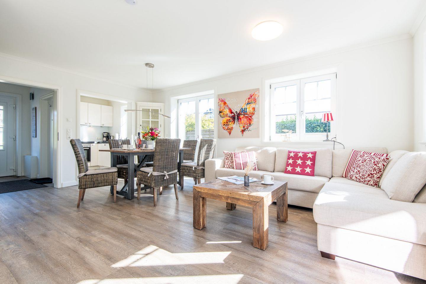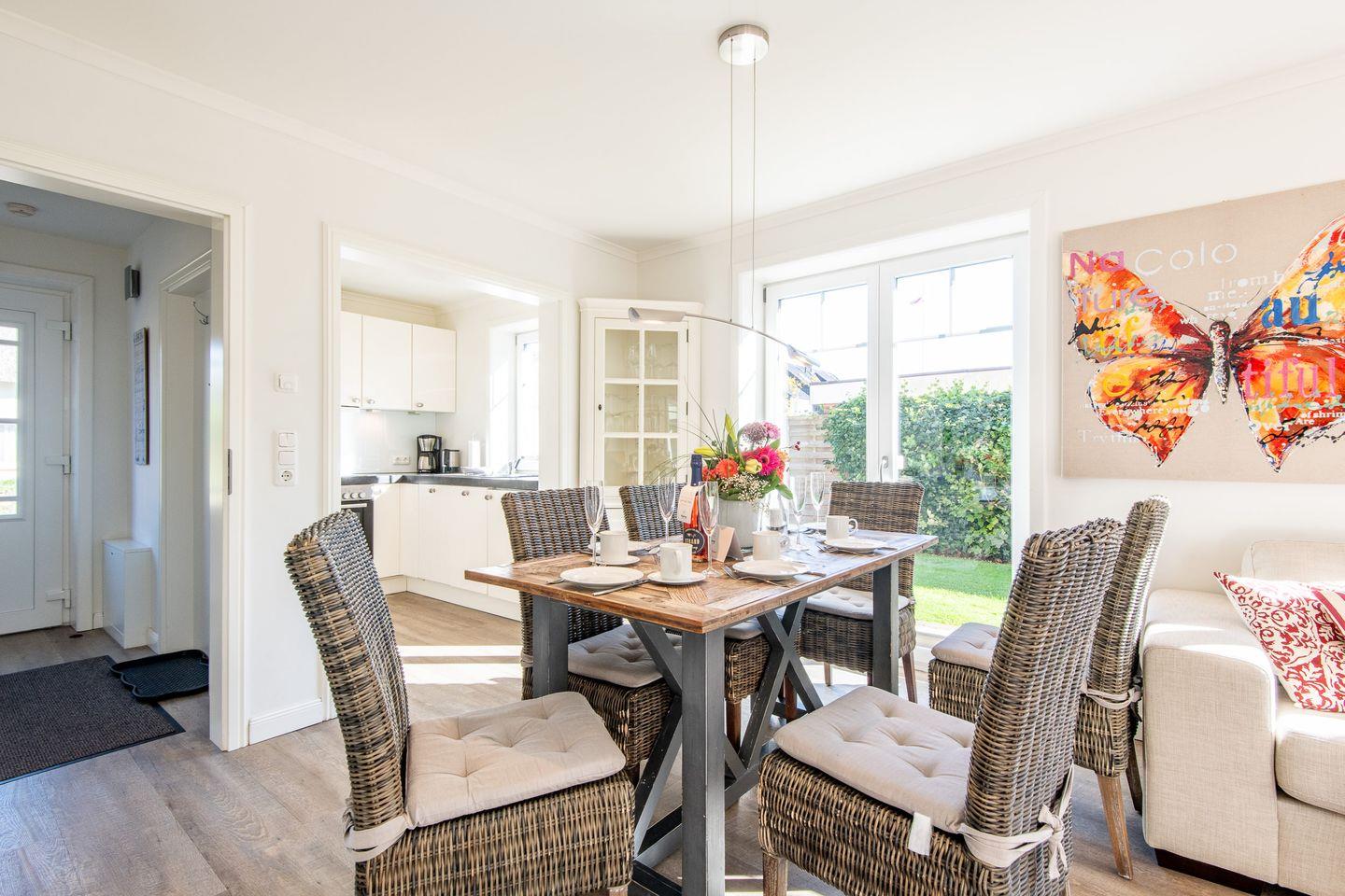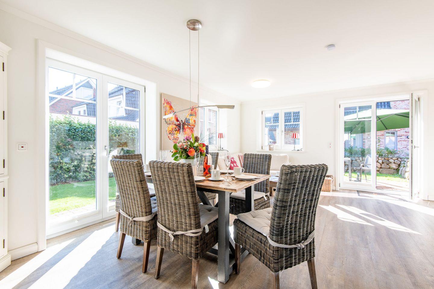 Das lichtdurchflutete Wohnzimmer ist mit einem gemütlichen Ecksofa und einem TV ausgestattet, ideal für entspannte Abende. Der angrenzende Essbereich bietet ausreichend Platz. Von hier aus haben Sie direkten Zugang zur möblierten Süd-Terrasse mit Strandkorb, wo Sie sonnige Stunden im Garten genießen können.