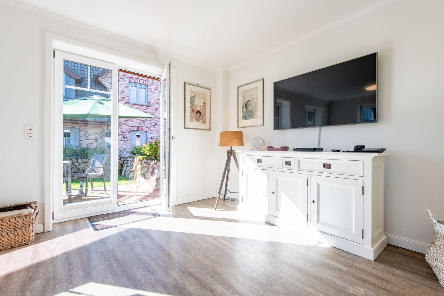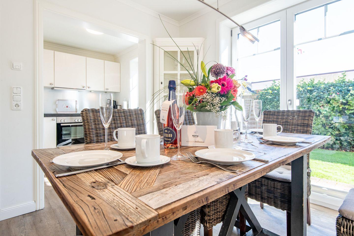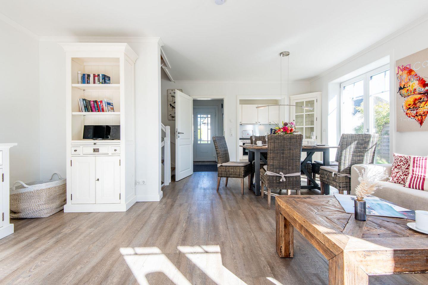 Das lichtdurchflutete Wohnzimmer ist mit einem gemütlichen Ecksofa und einem TV ausgestattet, ideal für entspannte Abende. Der angrenzende Essbereich bietet ausreichend Platz. Von hier aus haben Sie direkten Zugang zur möblierten Süd-Terrasse mit Strandkorb, wo Sie sonnige Stunden im Garten genießen können.