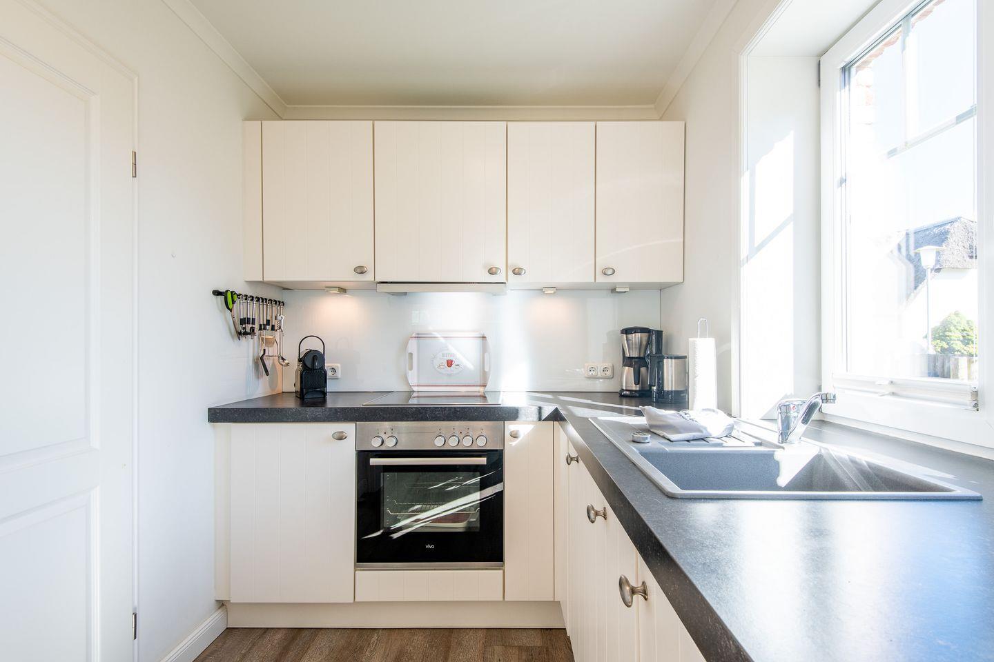 Die offene Küche bietet modernen Komfort mit einer vollständigen Ausstattung, darunter ein Geschirrspüler und eine DeLonghi Nescafe DolceGusto-Maschine. Hier finden Sie alles, was Sie für die Zubereitung köstlicher Mahlzeiten benötigen.