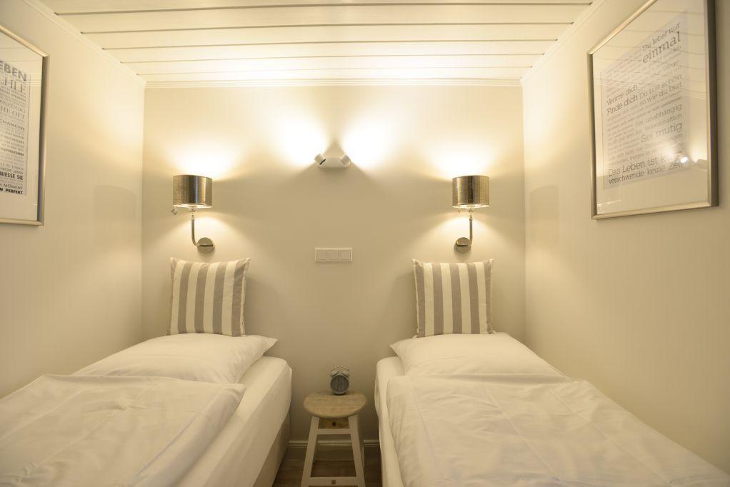 Im Schlafzimmer stehen zwei Einzelbetten (je 90x200 cm), die für eine flexible Nutzung zusammengeschoben werden können. Das Badezimmer verfügt über eine Dusche, WC, Handtuchwärmer und Föhn und bietet einen angenehmen Ort für Entspannung. Im Frühjahr 2026 ist die Renovierung des Badezimmer geplant und wird voraussichtlich im April 2026 abgeschlossen sein.