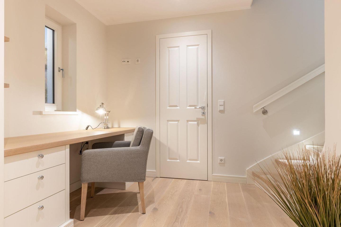Ein Arbeitsbereich mit großem Schreibtisch bietet Raum zum Schreiben, Malen oder Entspannen. Das gesamte Haus ist mit hochwertigem Parkett- und Natursteinboden, Hamburger Profilleisten und Fußbodenheizung in jedem Raum ausgestattet.