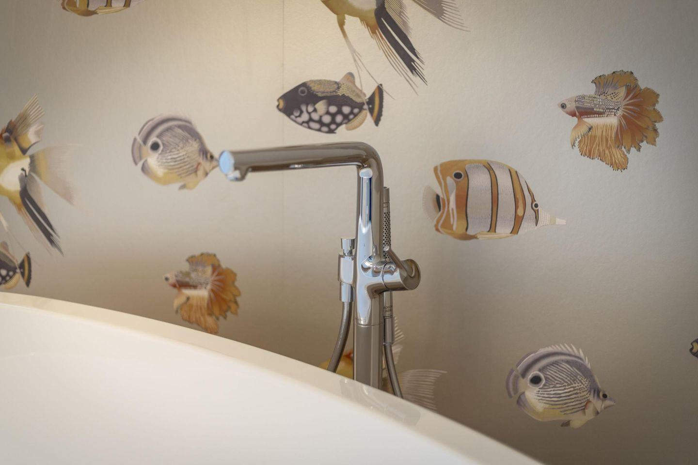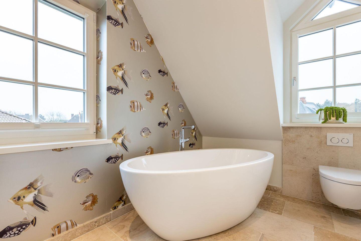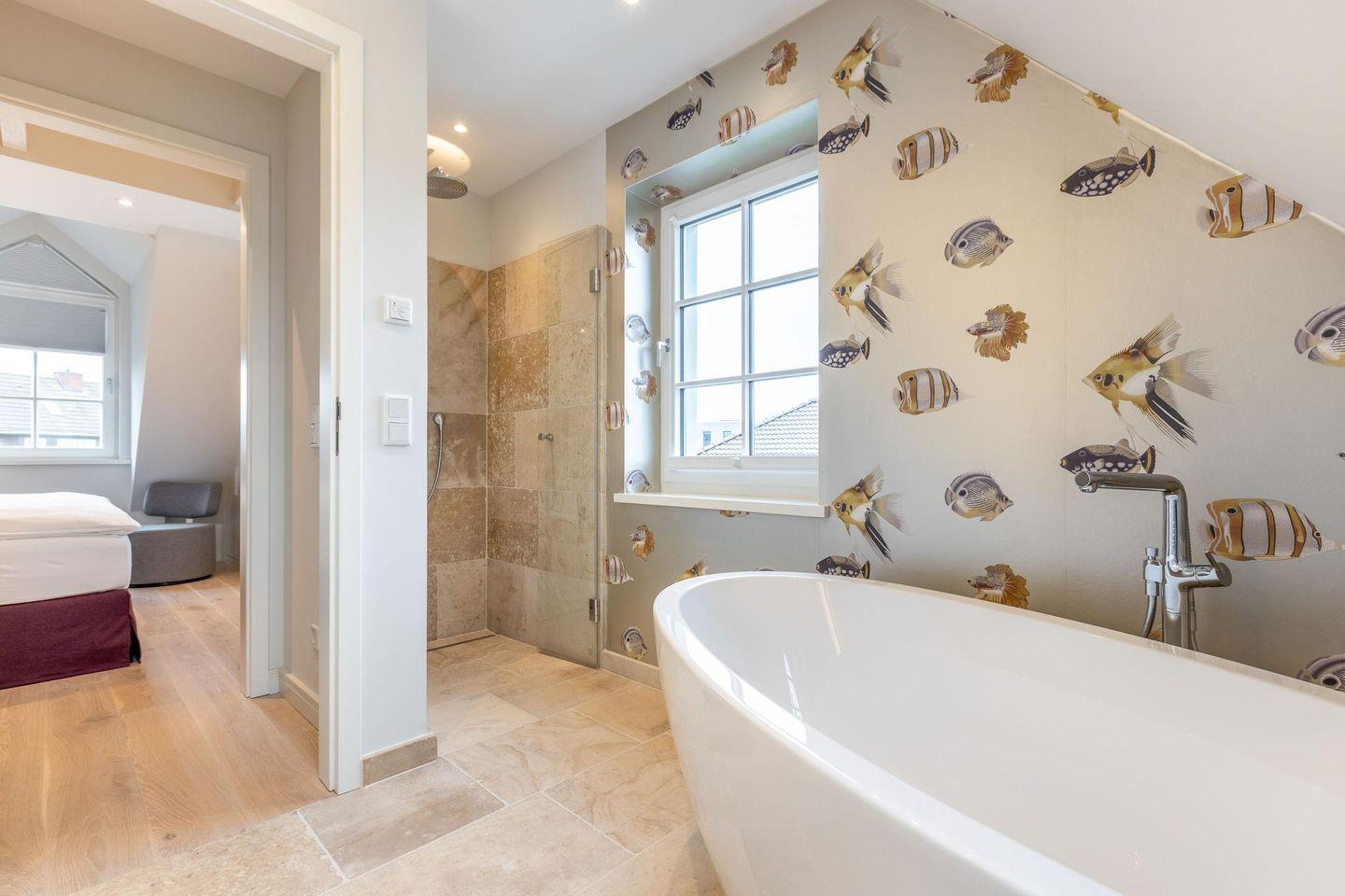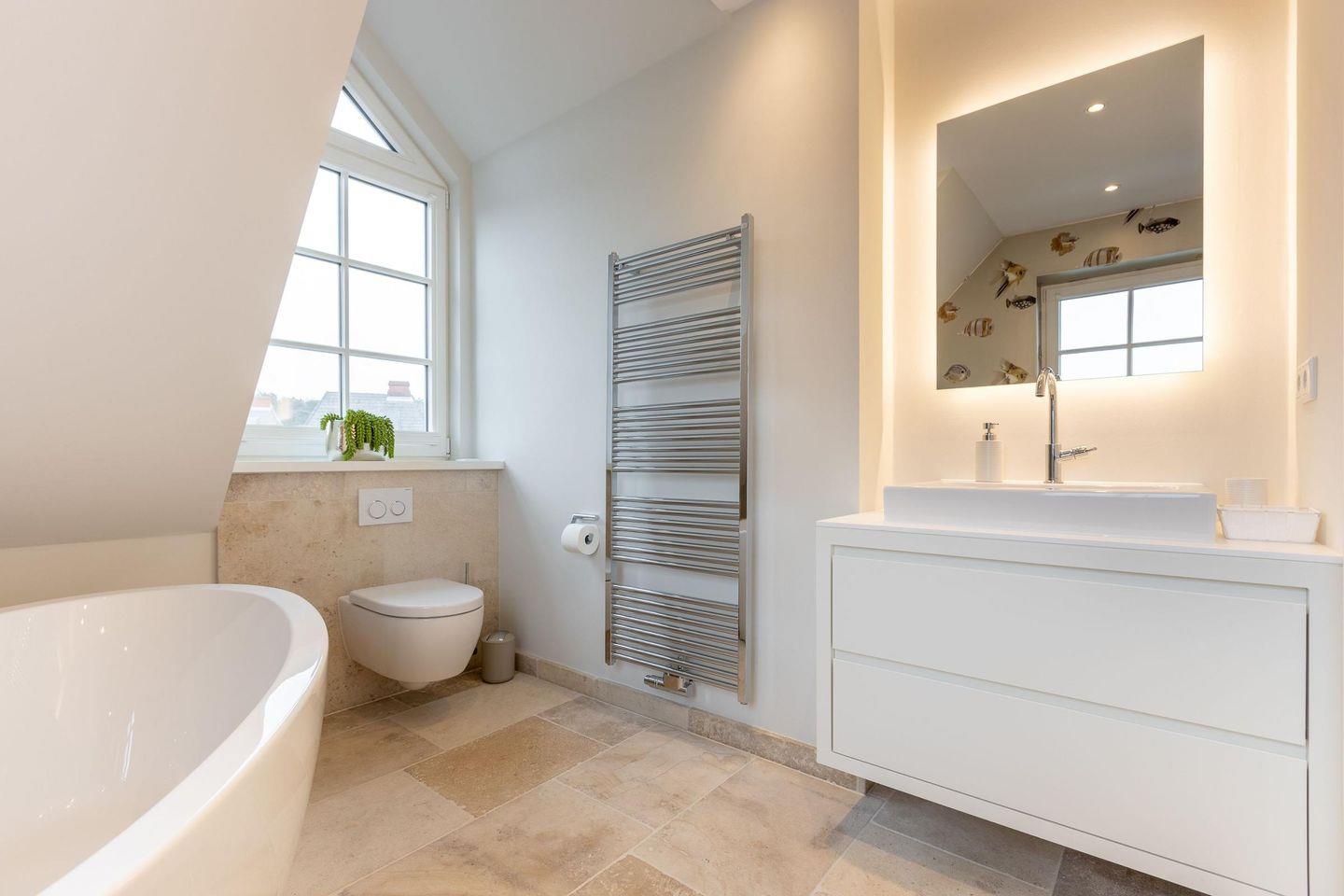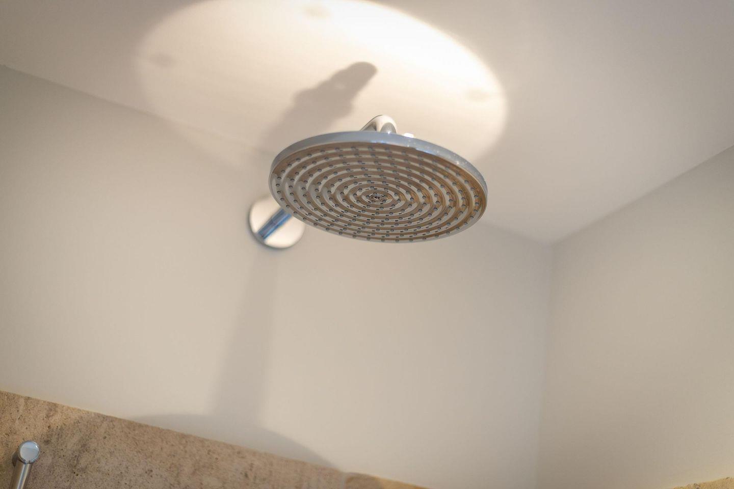 Das erste Badezimmer ist ein modernes Vollbad mit freistehender Badewanne, ebenerdiger Regendusche, WC, Handtuchwärmer und Föhn. Das zweite Badezimmer verfügt über eine weitere ebenerdige Regendusche und Handtuchwärmer. Zwei separate WCs und eine große Sauna bieten zusätzlichen Komfort.