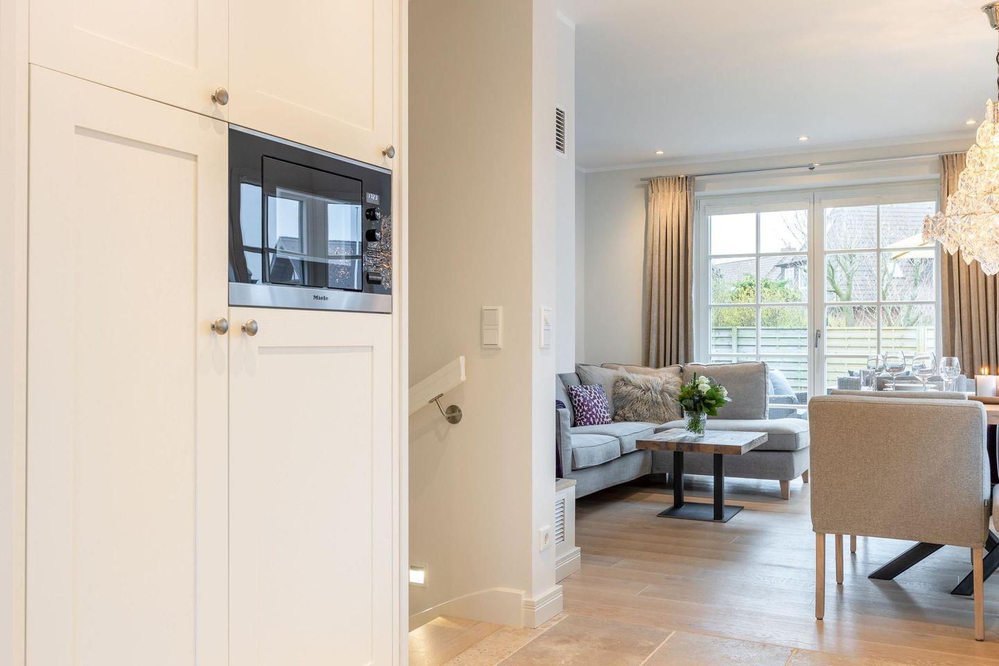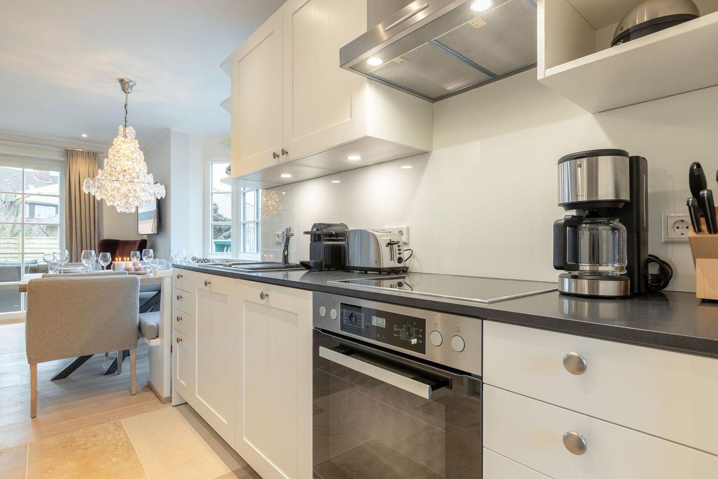 Die geräumige, offene Küche ist voll ausgestattet und bietet modernen Komfort mit Backofen, Mikrowelle, Cerankochfeld, Geschirrspüler, Nespresso- und Filterkaffeemaschine.