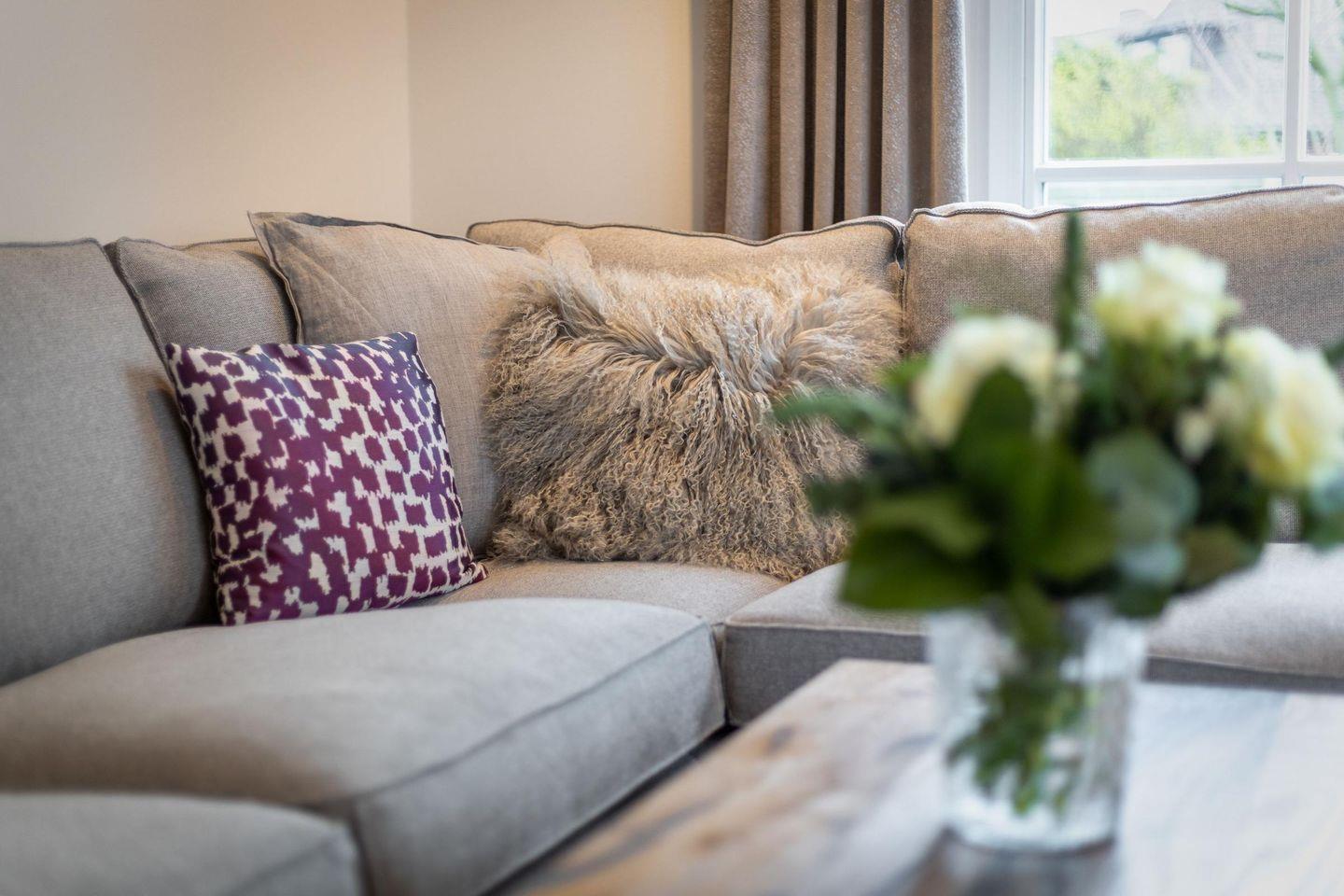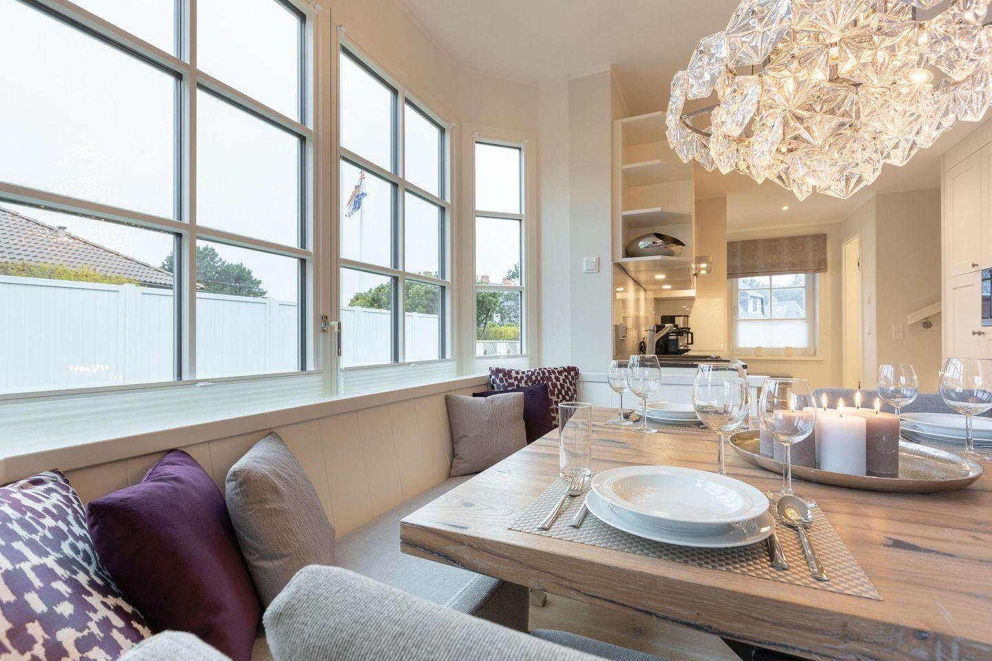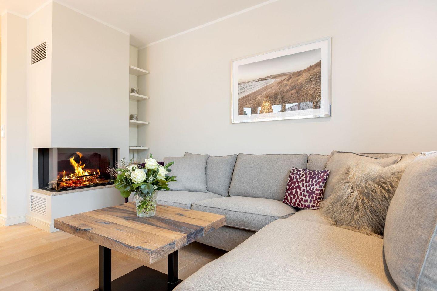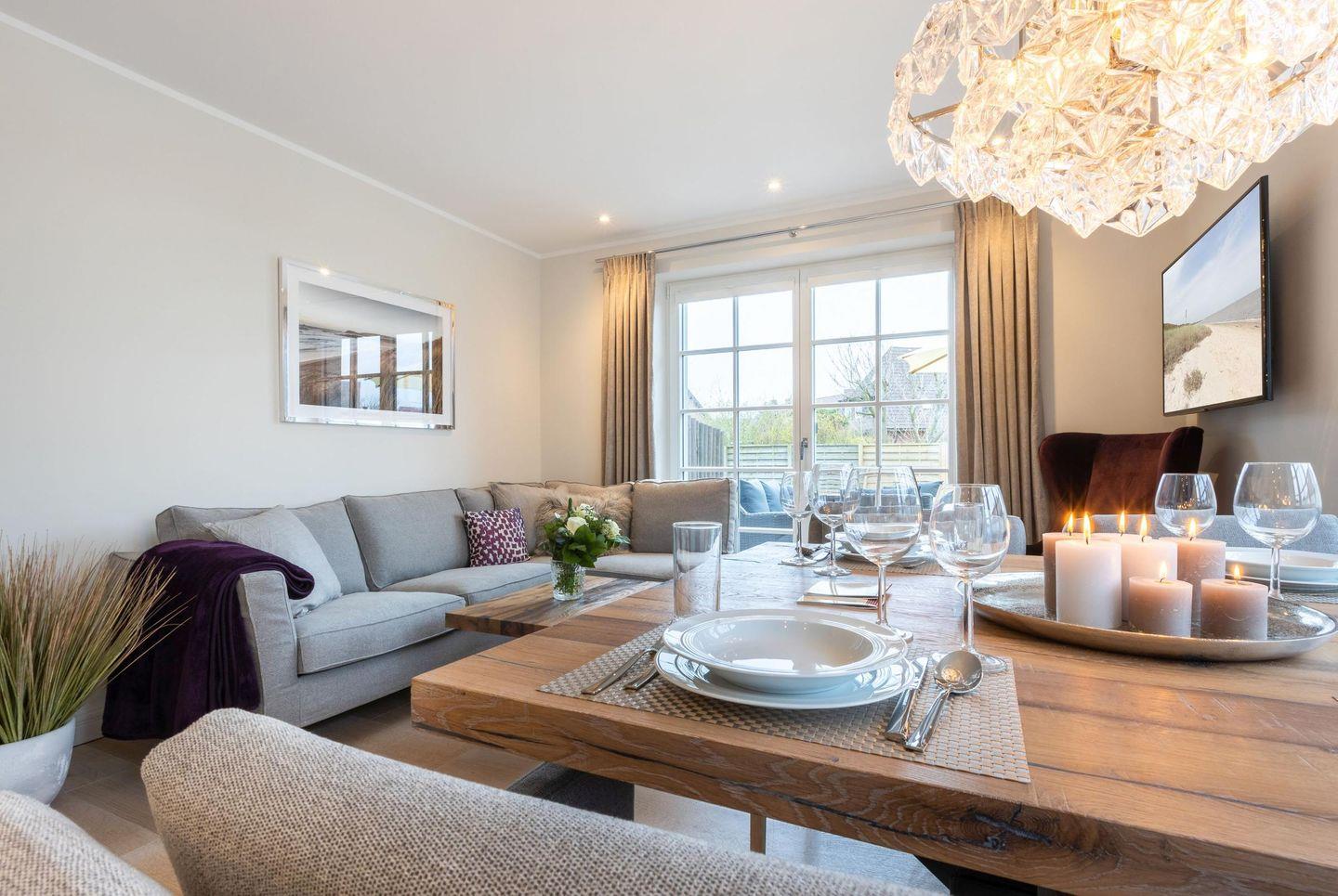 Im lichtdurchfluteten Wohn- und Essbereich mit einem eleganten West-Erker genießen Sie gemütliche Stunden auf der Sofalandschaft mit Blick auf den Gas-Kamin und den großen Smart-TV. Der Designer-Esstisch mit Eckbank und Polsterstühlen bietet Platz für gesellige Mahlzeiten. Vom Wohnbereich haben Sie direkten Zugang zur großzügigen Süd-Terrasse und zum Garten, wo Kinder sicher spielen können.