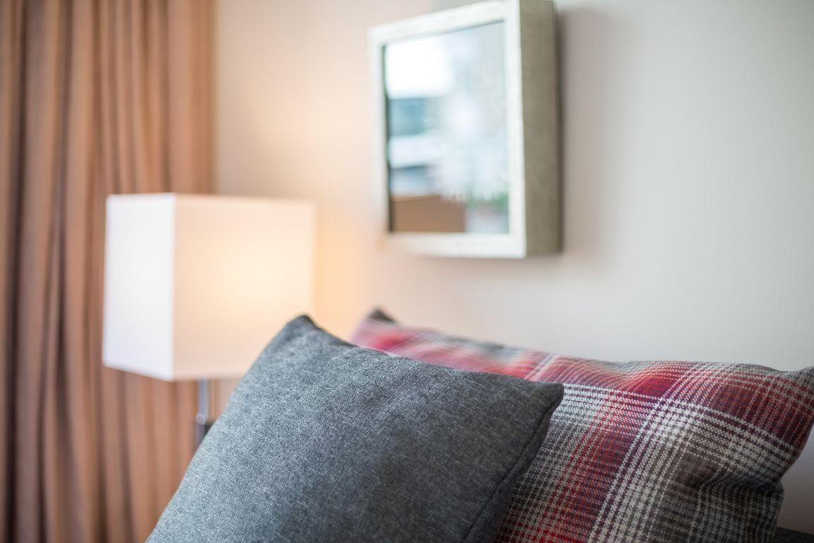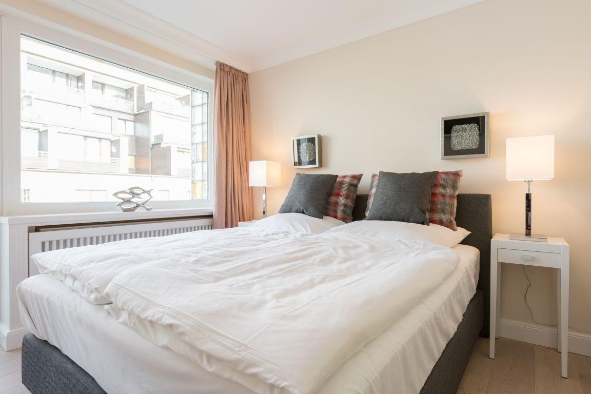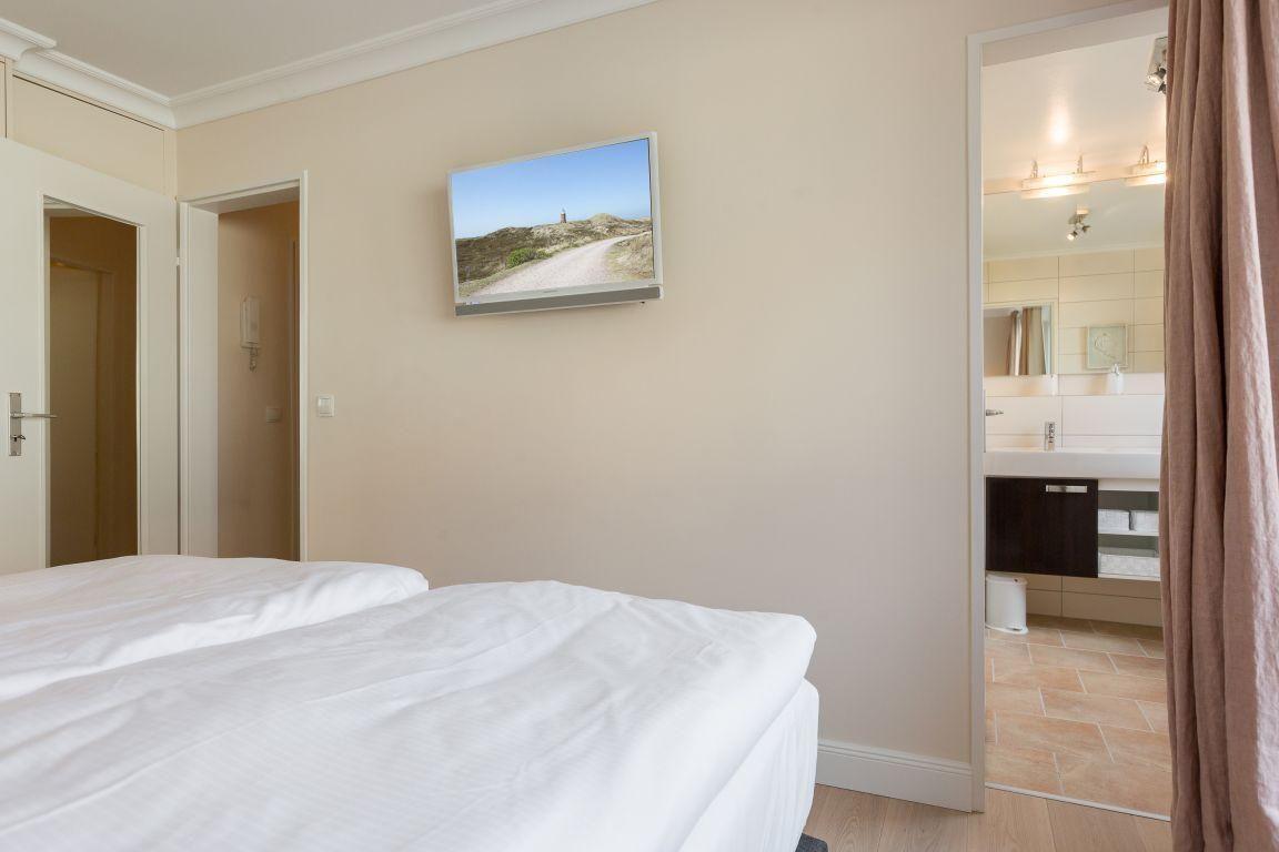 Das stilvoll eingerichtete Schlafzimmer verfügt über ein komfortables Boxspring-Doppelbett (160 x 200 cm) sowie ein TV und eine hochwertige HiFi-Anlage mit CD- und MP3-Player. Hier finden Sie Ruhe und Entspannung nach einem erlebnisreichen Tag auf Sylt.