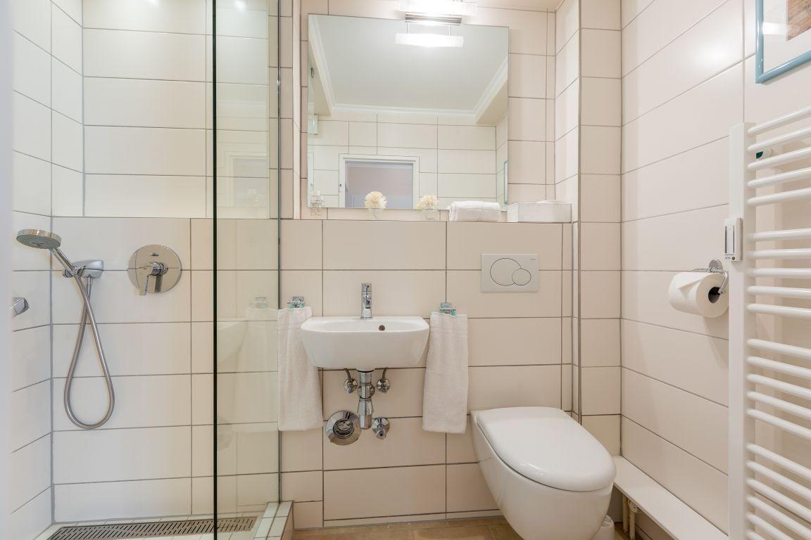Das kleine Badezimmer ist mit einer modernen Dusche und einem Handtuchwärmer ausgestattet, um Ihnen den bestmöglichen Komfort zu bieten. Die geschmackvolle Einrichtung und liebevollen Details lassen keine Wünsche offen und machen den Aufenthalt zu einem besonderen Erlebnis.