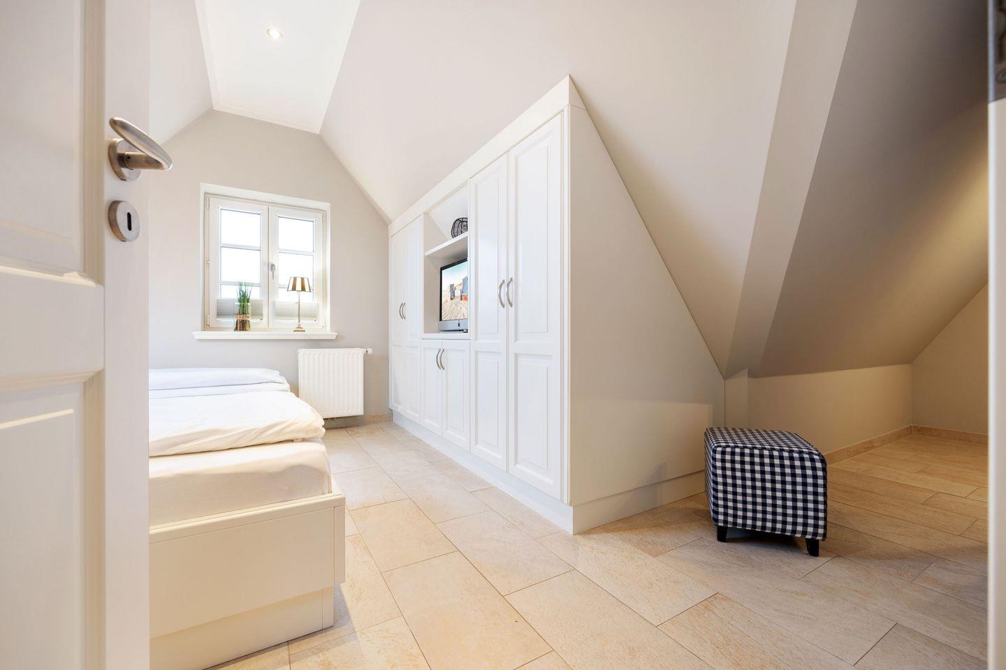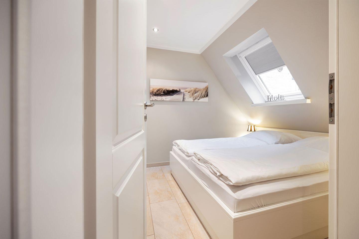 Im ersten Schlafzimmer erwartet Sie ein komfortables Doppelbett (2x 80x200 cm) und ein geräumiger Einbauschrank. Das zweite Schlafzimmer im Dachgeschoss verfügt über zwei Einzelbetten (je 90x200 cm), einen weiteren Einbauschrank, zwei Hocker und ein TV. Ein kleiner Dünenblick rundet das Ambiente ab. Für zusätzlichen Komfort gibt es hier ein Gäste-WC en suite.