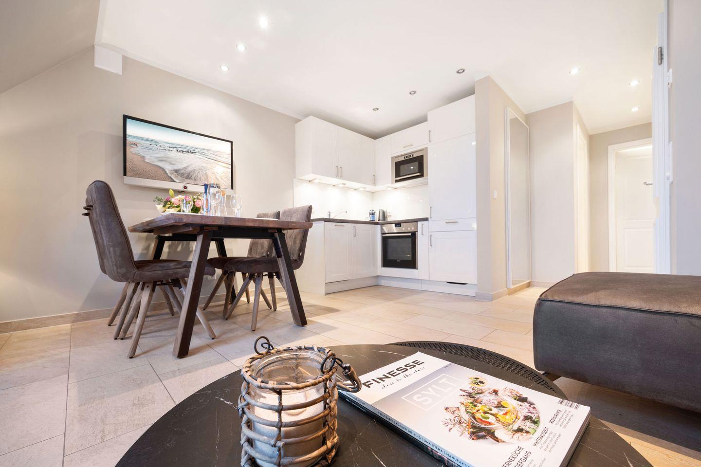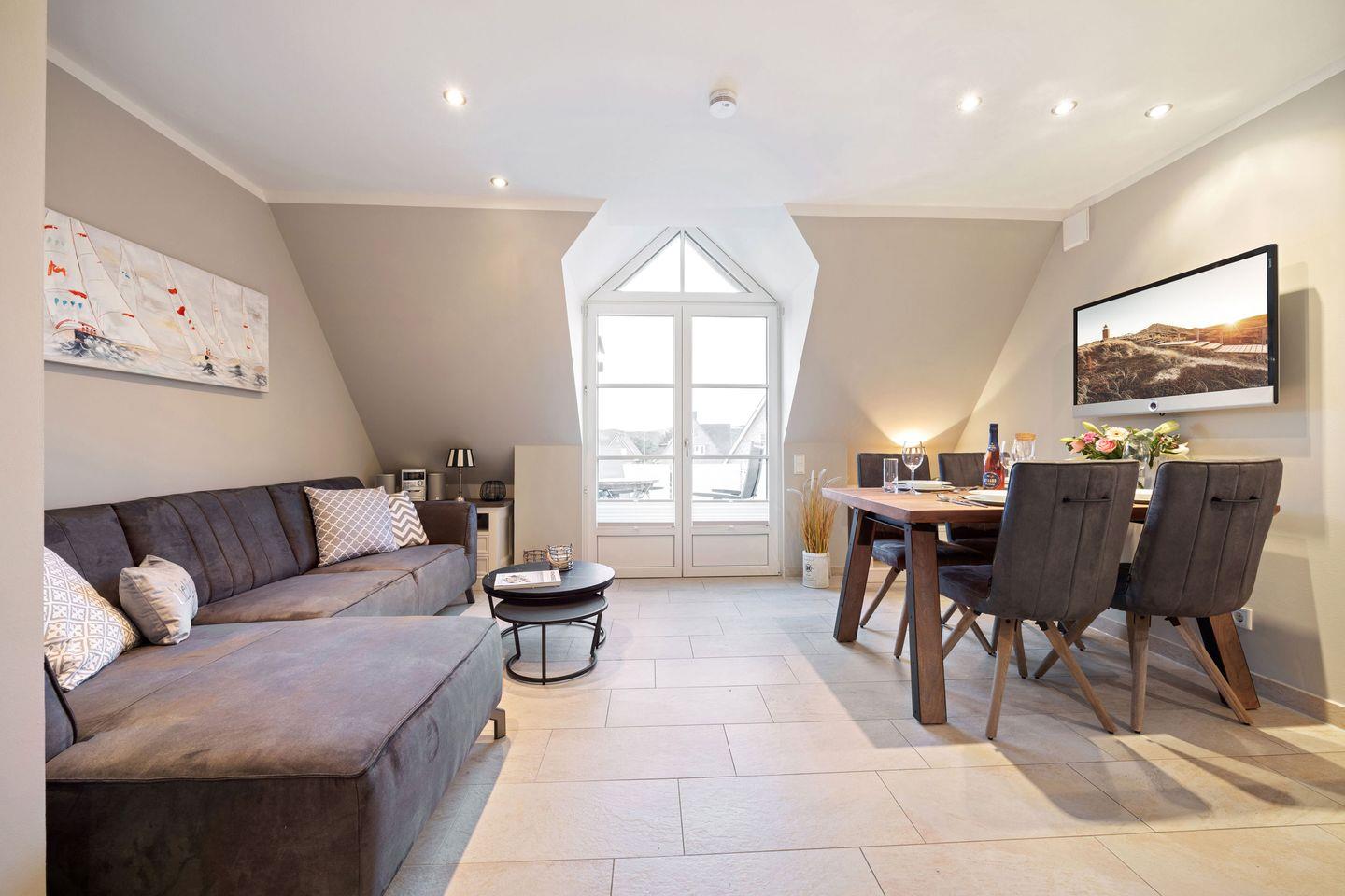 Der lichtdurchflutete Wohn- und Essbereich bietet mit seinem großen Ecksofa und einem Esstisch für 4 Personen den perfekten Ort zum Verweilen. Vom Wohnzimmer aus gelangen Sie direkt auf den möblierten Balkon in Westausrichtung – ideal, um abends die frische Nordseeluft zu genießen.