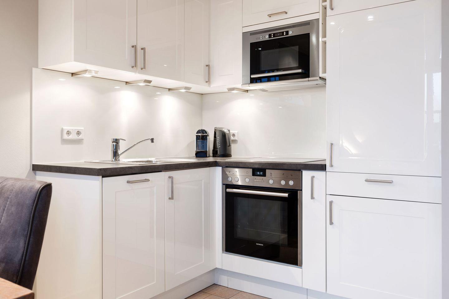 Die offene Küche ist mit einem 4-flammigen Herd, Geschirrspüler und weiteren modernen Annehmlichkeiten ausgestattet und bietet Ihnen die Möglichkeit, gemeinsame Mahlzeiten mühelos zuzubereiten.