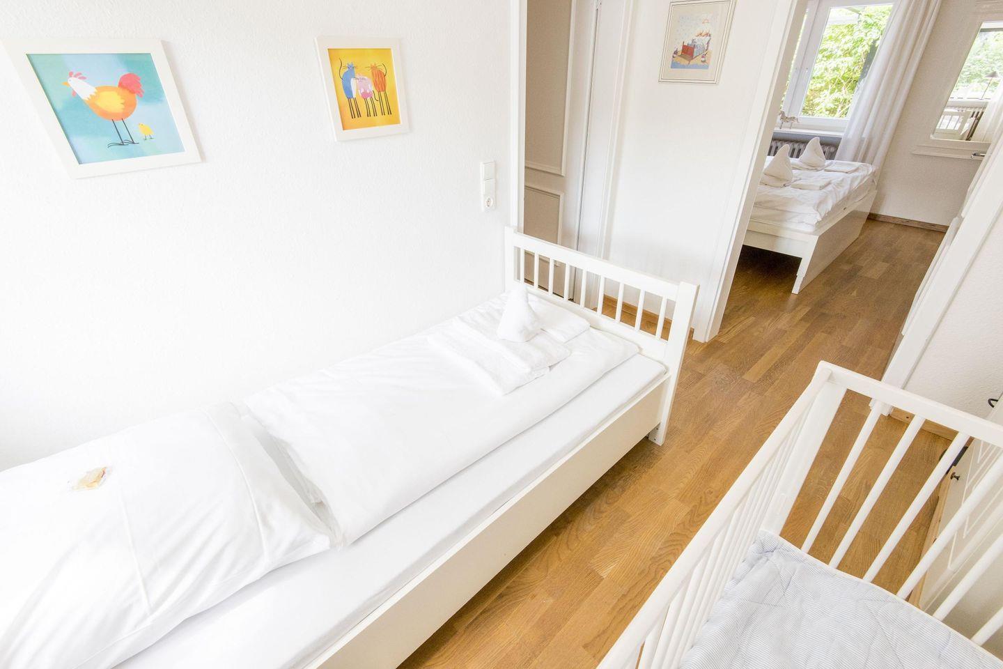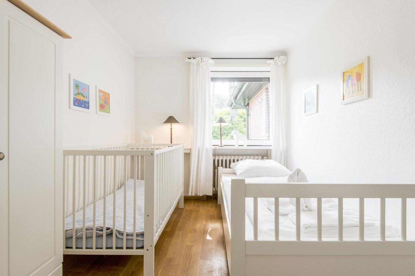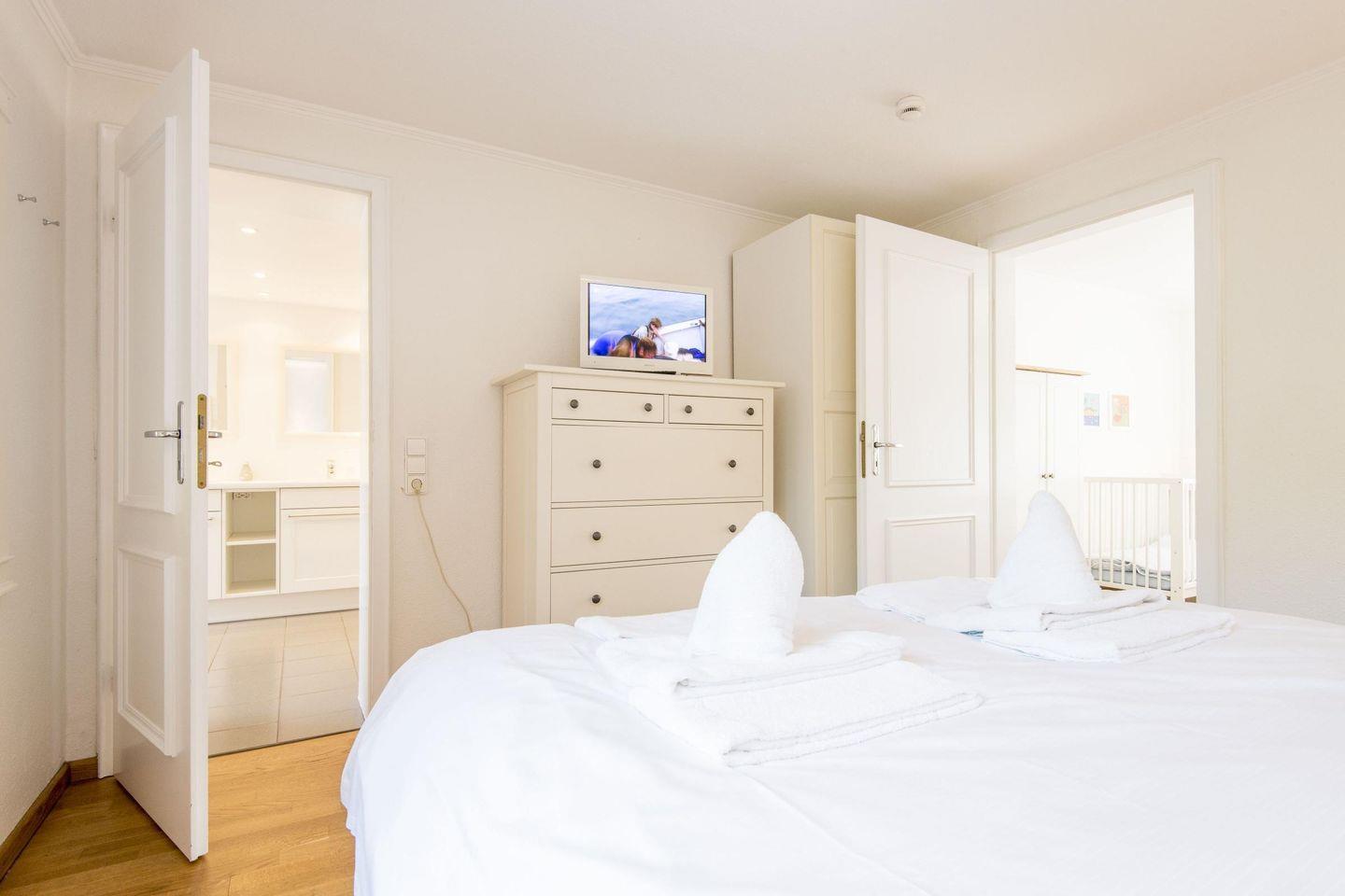 Die vier stilvoll eingerichteten Schlafzimmer bieten jedem Gast einen komfortablen Rückzugsort und erholsamen Schlaf. Das Hauptschlafzimmer ist mit einem großzügigen Doppelbett (160x200 cm), einem Kleiderschrank, einer Kommode und einem TV ausgestattet und verfügt über ein privates Badezimmer en suite. Das zweite Schlafzimmer ist besonders kinderfreundlich gestaltet: Es bietet zwei Kojen-Einzelbetten (je 100x180 cm), einen Schrank, einen kleinen Tisch und zwei Kinderstühle, ebenfalls mit einem eigenen Badezimmer en suite. Das dritte Schlafzimmer bietet ein weiteres Doppelbett (160x200 cm) sowie Stauraum durch einen Kleiderschrank und eine Kommode. Ein viertes, gemütliches Schlafzimmer ist mit einem Einzelbett (90x190 cm) und einem kleinen Kinderbett (75x140 cm) ausgestattet, wodurch sich das Domizil perfekt für Familien eignet.