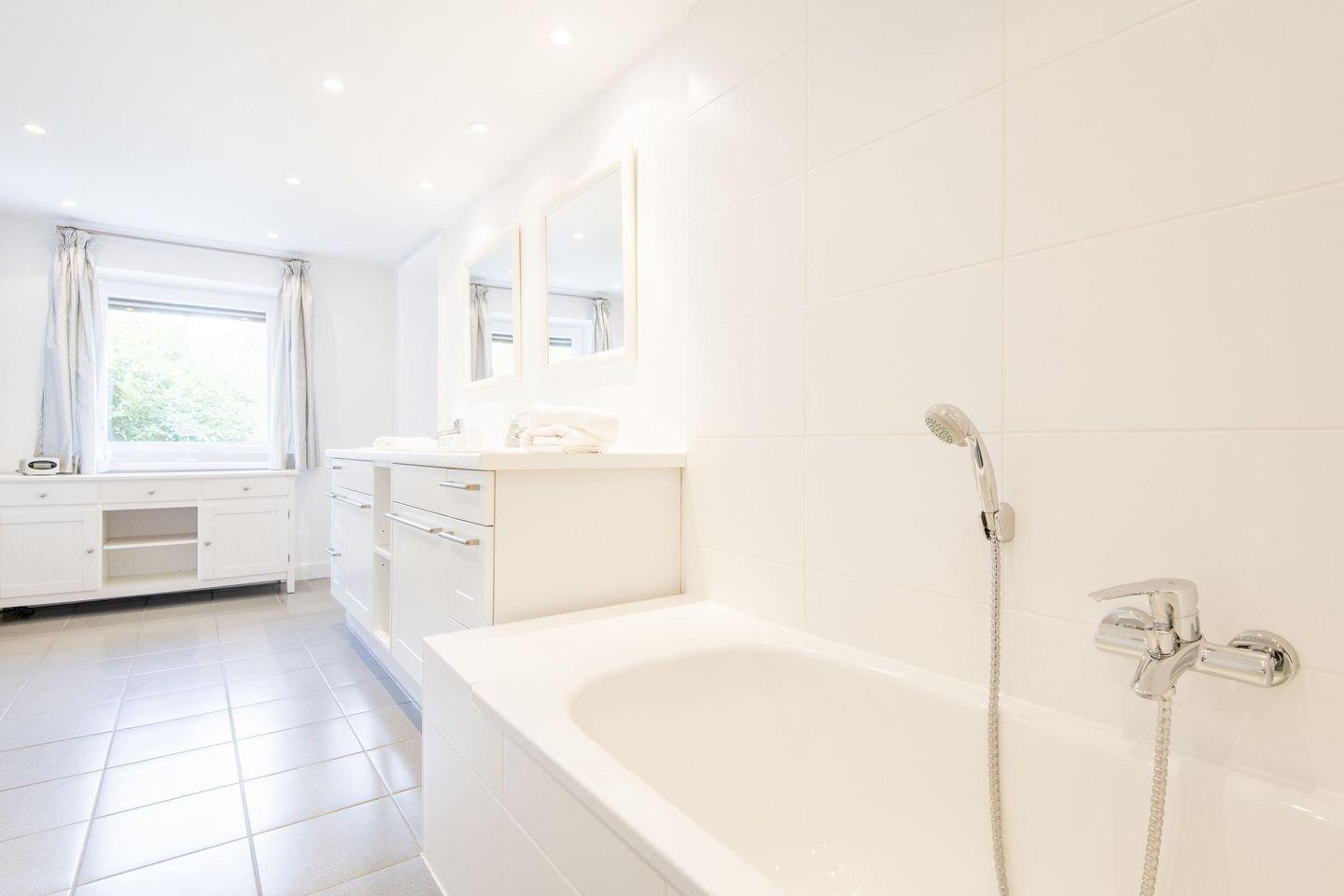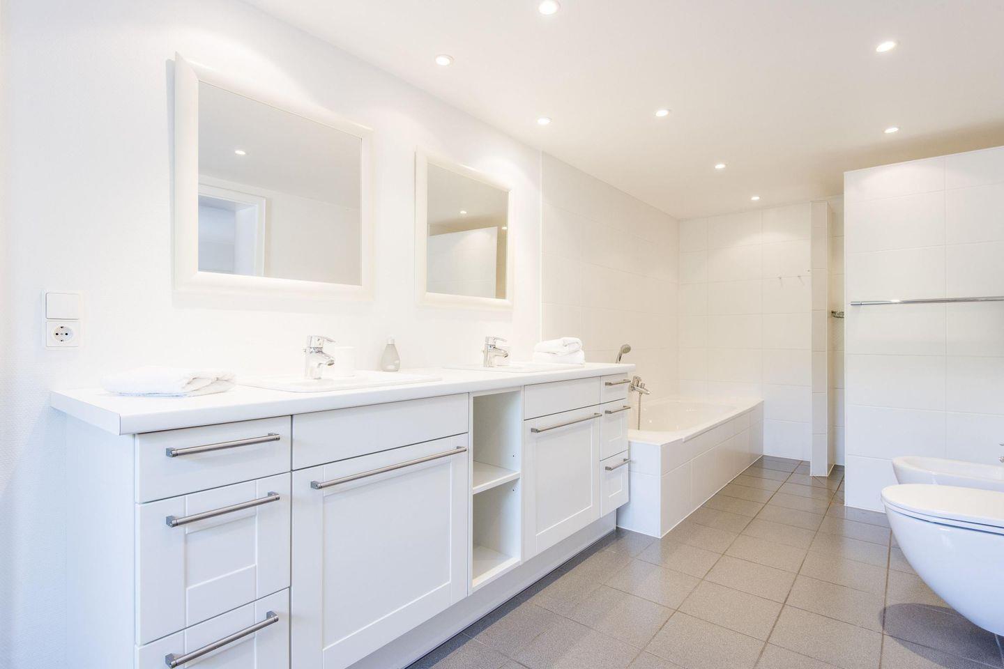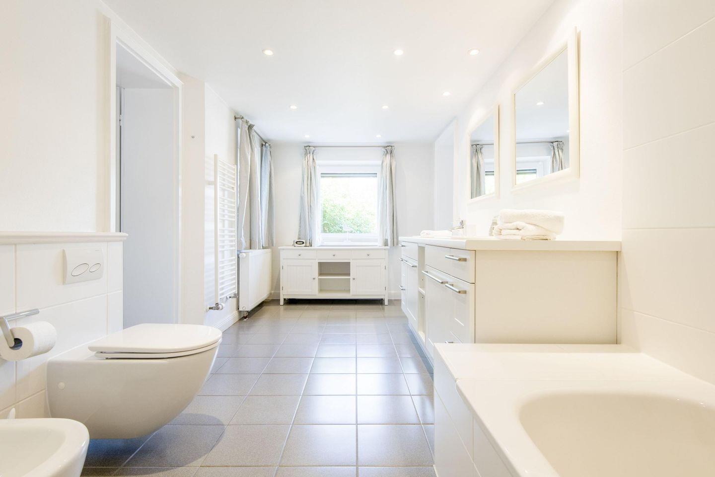 Die drei Badezimmer des Hauses bieten modernen Komfort und stilvolle Ausstattung: Das erste Badezimmer, direkt vom Hauptschlafzimmer aus zugänglich, verfügt über ein luxuriöses Vollbad mit Badewanne, einer separaten ebenerdigen Regendusche, zwei Waschbecken, WC, Bidet, Handtuchwärmer und Tageslicht. Das zweite Badezimmer im Kinderzimmerbereich ist als Duschbad konzipiert und bietet neben der Dusche auch ein WC und Tageslicht für einen angenehmen Start in den Tag. Weiterhin steht ein drittes Badezimmer mit Dusche, WC und Tageslicht zur Verfügung. Auf diese Weise ist für die Privatsphäre aller Gäste gesorgt.