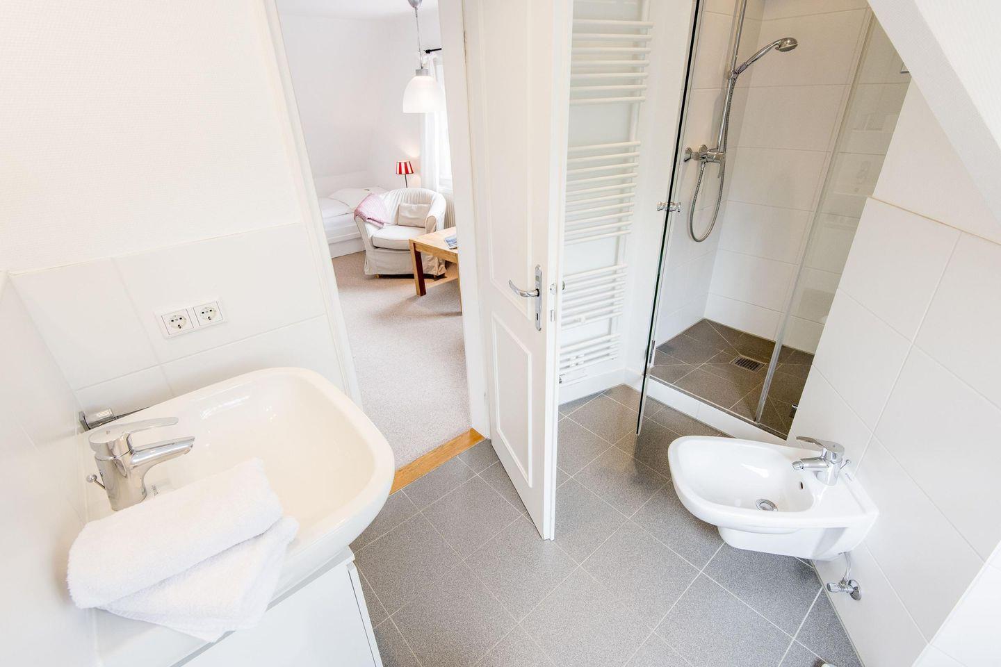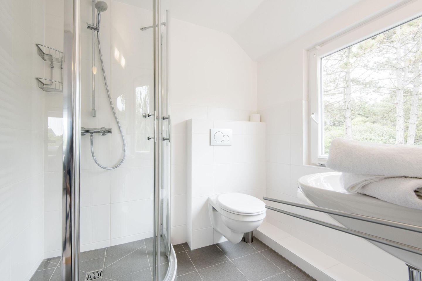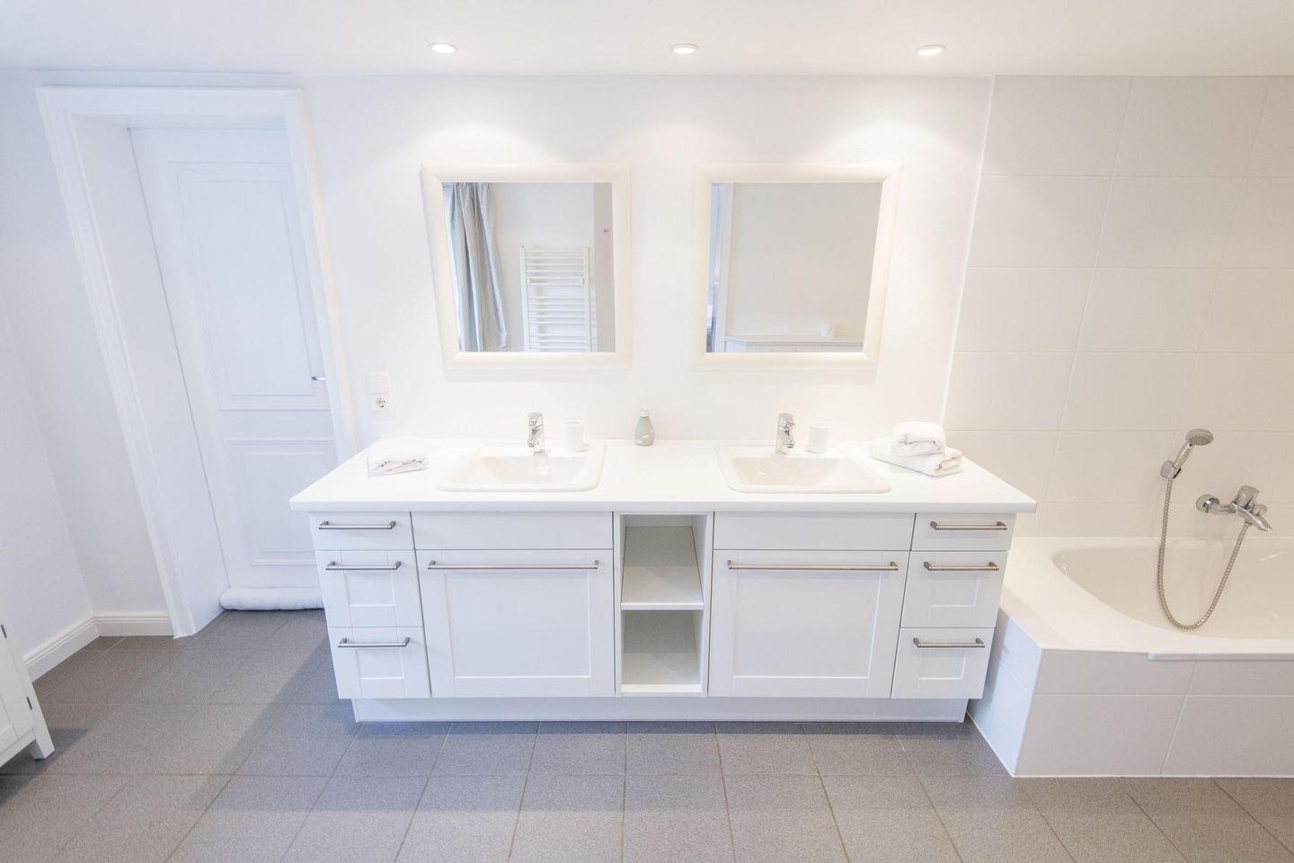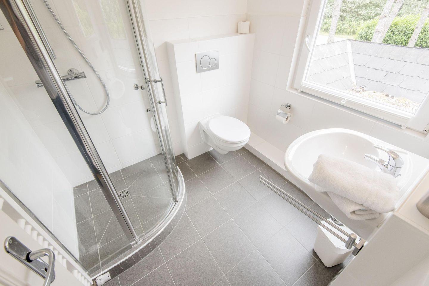 Die drei Badezimmer des Hauses bieten modernen Komfort und stilvolle Ausstattung: Das erste Badezimmer, direkt vom Hauptschlafzimmer aus zugänglich, verfügt über ein luxuriöses Vollbad mit Badewanne, einer separaten ebenerdigen Regendusche, zwei Waschbecken, WC, Bidet, Handtuchwärmer und Tageslicht. Das zweite Badezimmer im Kinderzimmerbereich ist als Duschbad konzipiert und bietet neben der Dusche auch ein WC und Tageslicht für einen angenehmen Start in den Tag. Weiterhin steht ein drittes Badezimmer mit Dusche, WC und Tageslicht zur Verfügung. Auf diese Weise ist für die Privatsphäre aller Gäste gesorgt.
