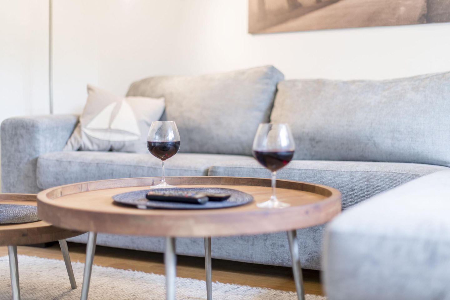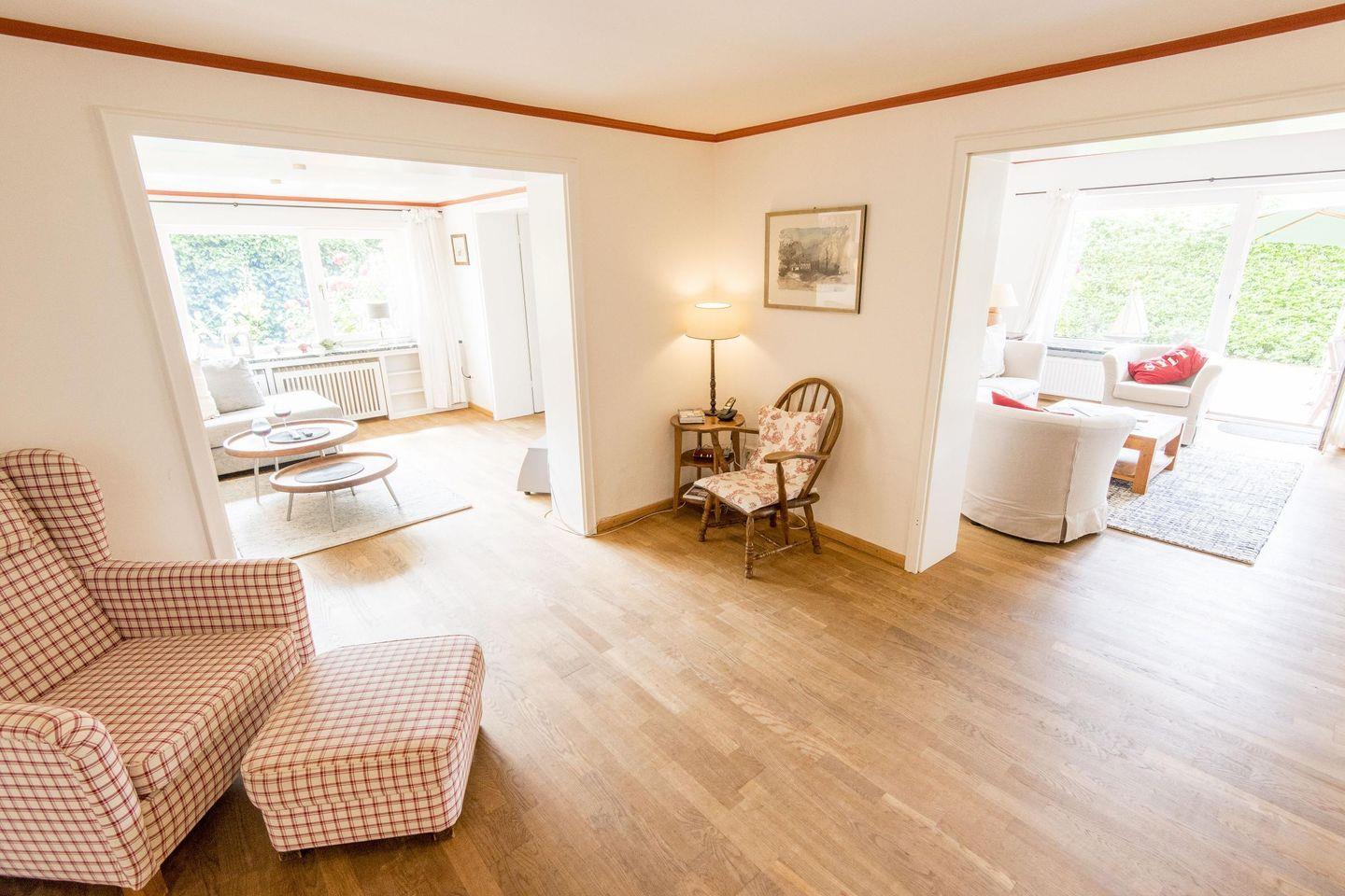 Das helle Wohnzimmer verfügt über ein großes Sofa, zwei Sessel und einen Esstisch für 8 Personen. Von hier gelangen Sie direkt auf die möblierte Südterrasse mit Zugang zum weitläufigen Garten, ideal für gemeinsame Mahlzeiten und sonnige Stunden im Freien. Eine zusätzliche überdachte Terrasse auf der Ostseite sorgt für vielseitige Nutzungsmöglichkeiten. Das gemütliche Kaminzimmer mit Kachelofen bietet eine Oase der Entspannung, und das separate Fernsehzimmer im Obergeschoss lädt zum Abschalten ein. Ein Arbeitszimmer mit Schreibtisch und Faxgerät steht ebenfalls zur Verfügung.