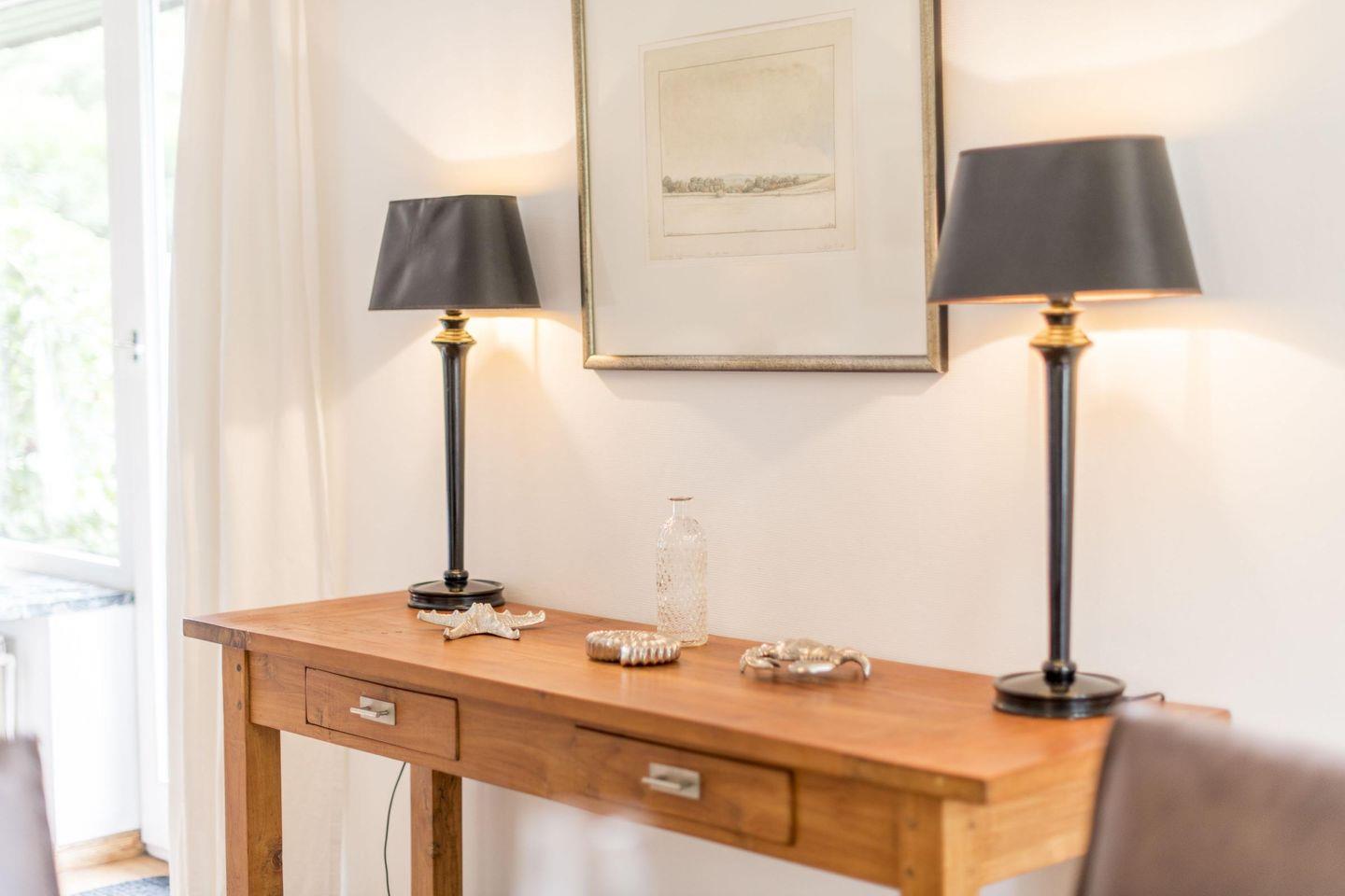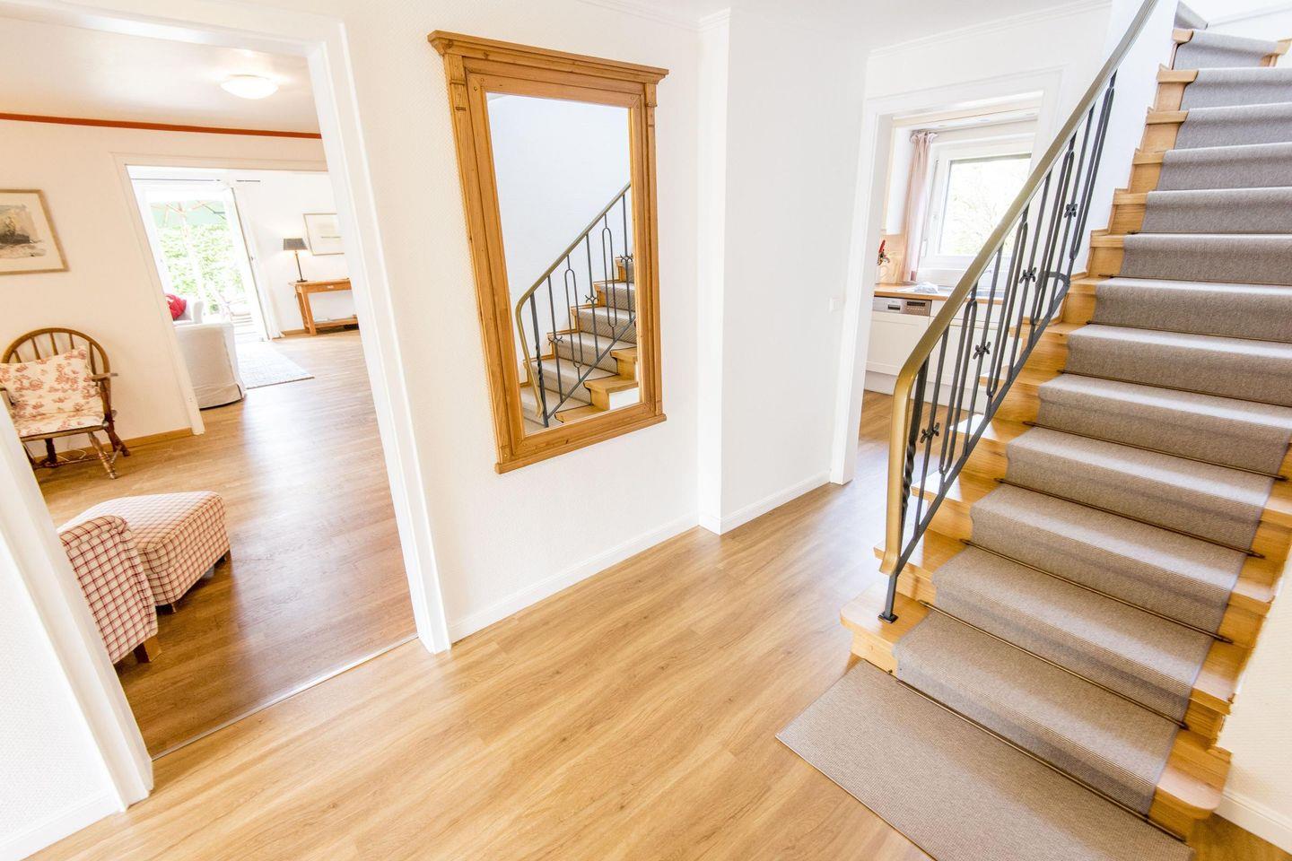 Eine große Diele mit Garderobe und Gäste-WC im Eingangsbereich bietet reichlich Stauraum. Eine Waschmaschine und ein Trockner befinden sich im Keller. WLAN (ohne Gewähr) steht Ihnen zur Verfügung, und vor dem Haus finden bis zu drei PKWs Platz für eine entspannte An- und Abreise.