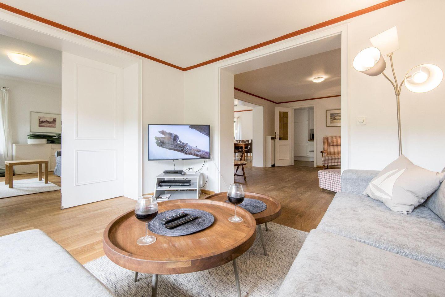 4 Schlafzimmer, 3 Badezimmer mit Dusche oder Vollbad, separate Küche, Wohnzimmer mit Essbereich, Kamin, möblierte Terrasse mit Garten, WLAN (ohne Gewähr) vorhanden, PKW-Stellplatz, Hunde auf Anfrage willkommen (ausschließlich im EG)