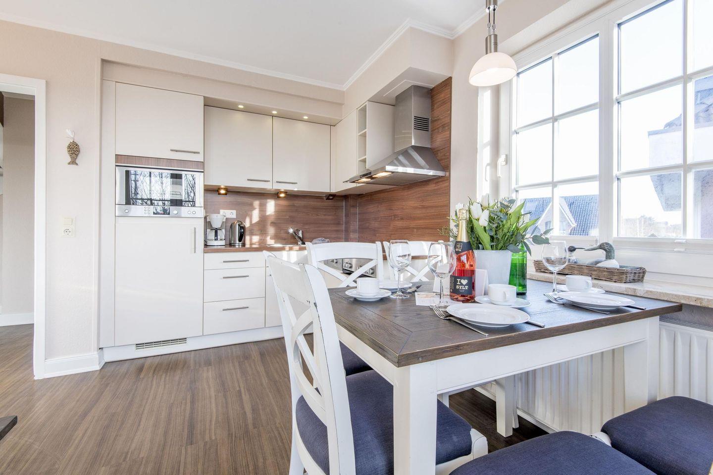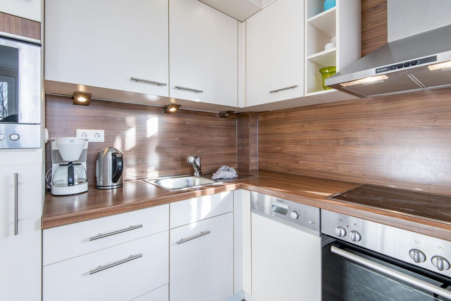 Die offene Küche ist voll ausgestattet und bietet unter anderem einen Geschirrspüler und modernen Komfort für Ihre Urlaubsmahlzeiten.