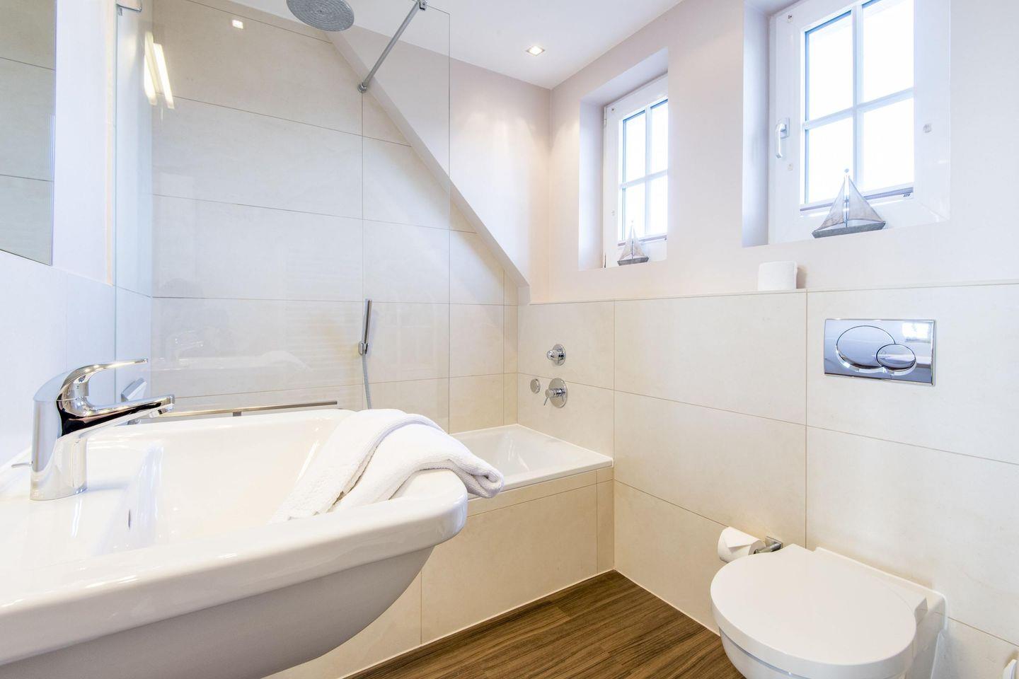 Das Badezimmer ist lichtdurchflutet und verfügt über eine Badewanne, eine Regendusche und ein WC.