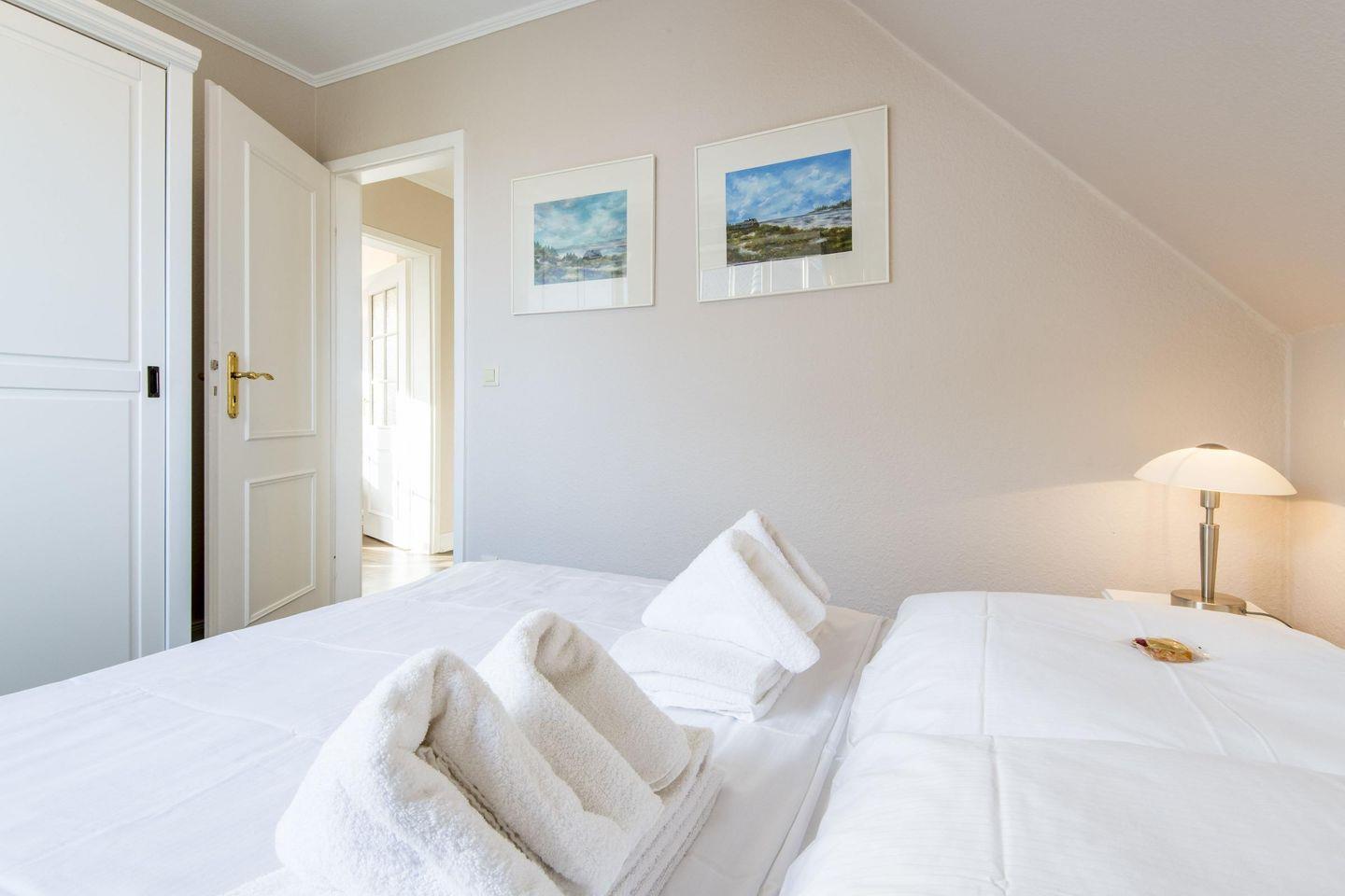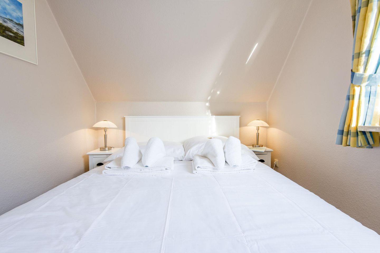 Das erste Schlafzimmer ist mit einem Doppelbett (2x 90x195 cm) und einem Kleiderschrank ausgestattet. Das zweite Schlafzimmer verfügt über ein breiteres Doppelbett (140x200 cm), Sessel und einen geräumigen Kleiderschrank.