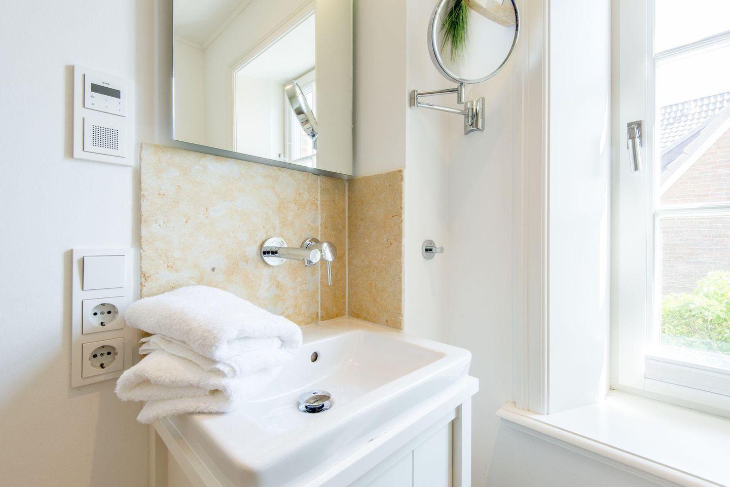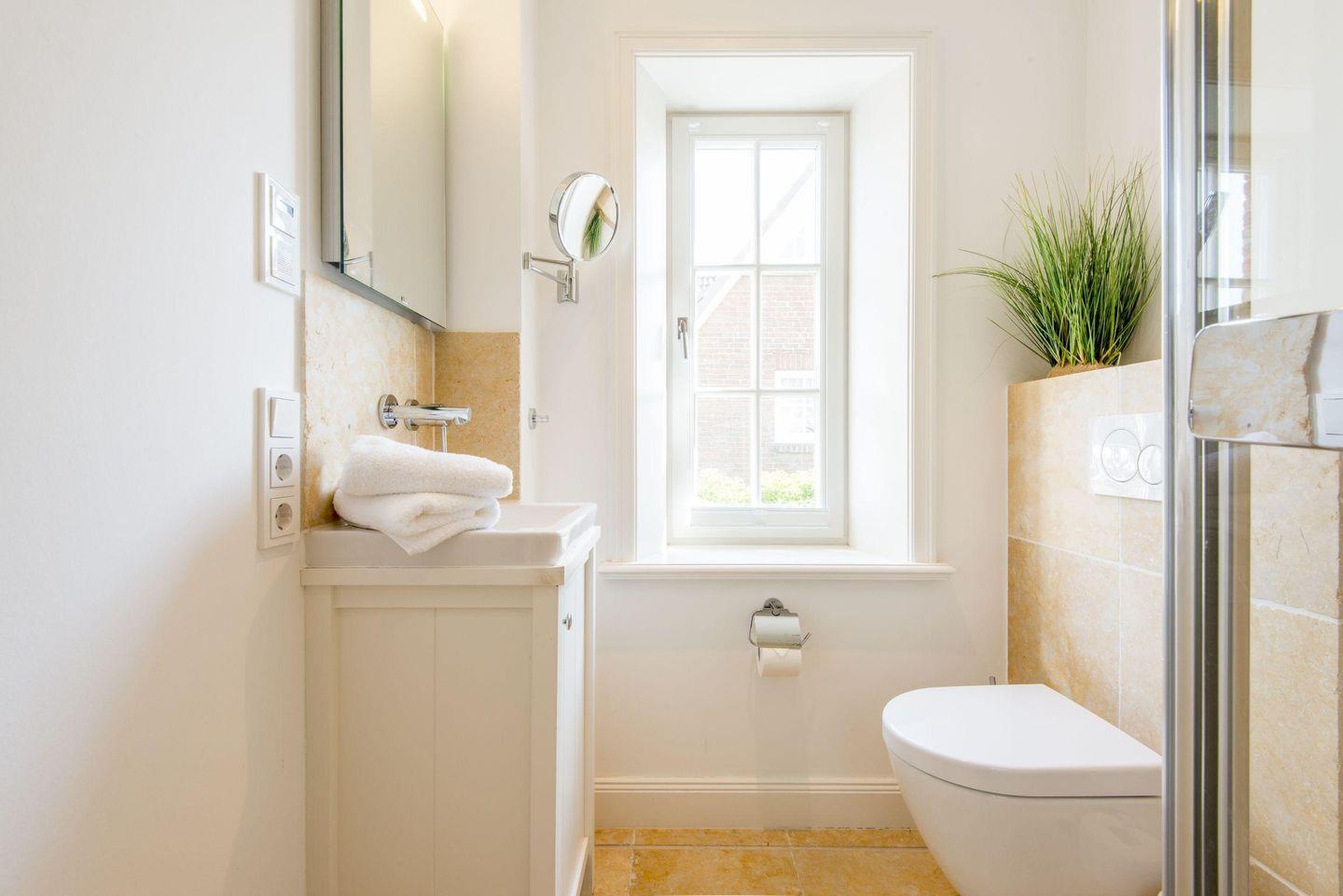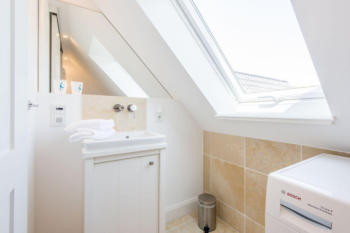 Das helle Badezimmer verfügt über eine ebenerdige Regendusche, WC, Handtuchwärmer und Tageslicht. Zusätzlich gibt es ein Gäste-WC mit Handtuchwärmer und Waschtrockner, was besonders für längere Aufenthalte praktisch ist.