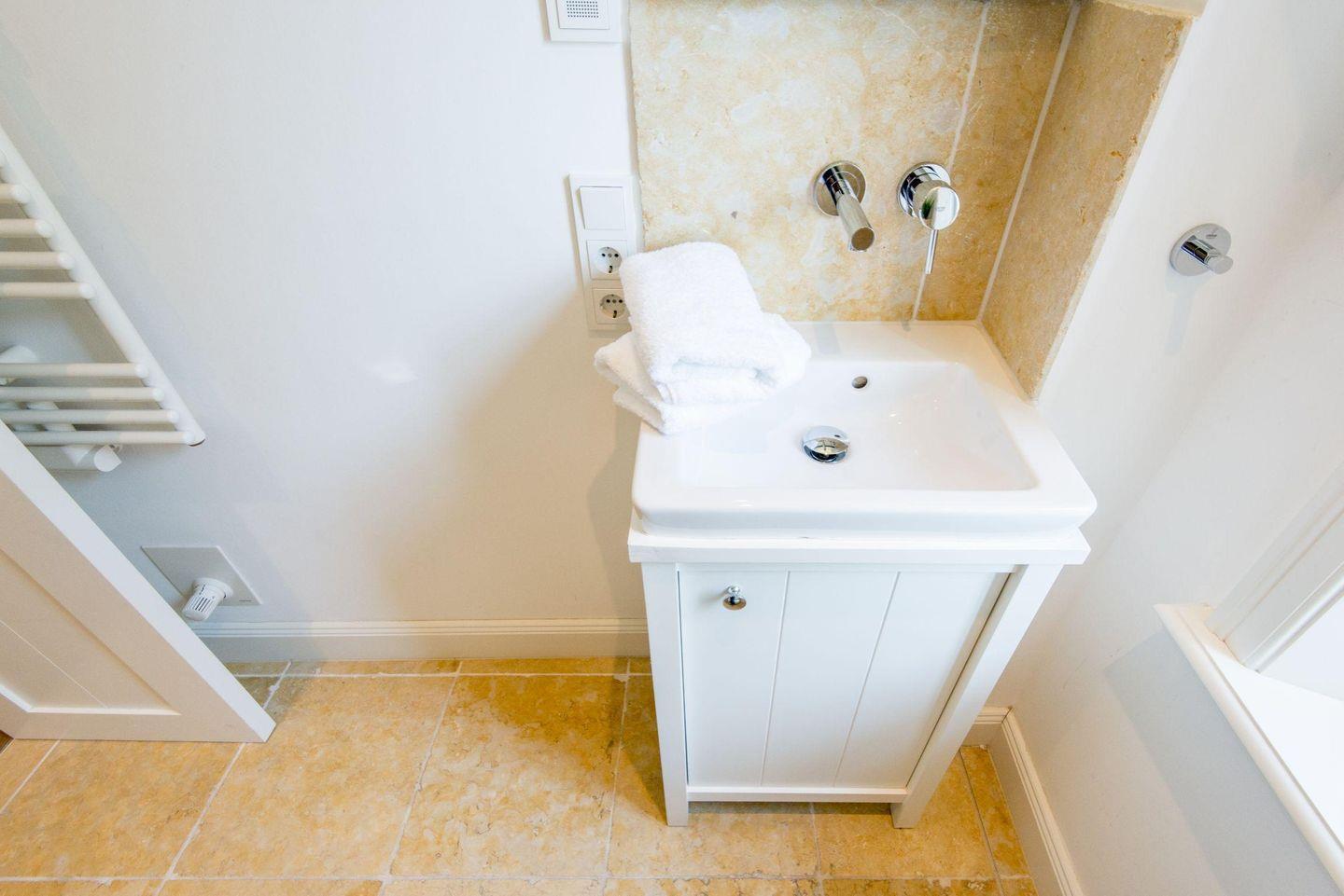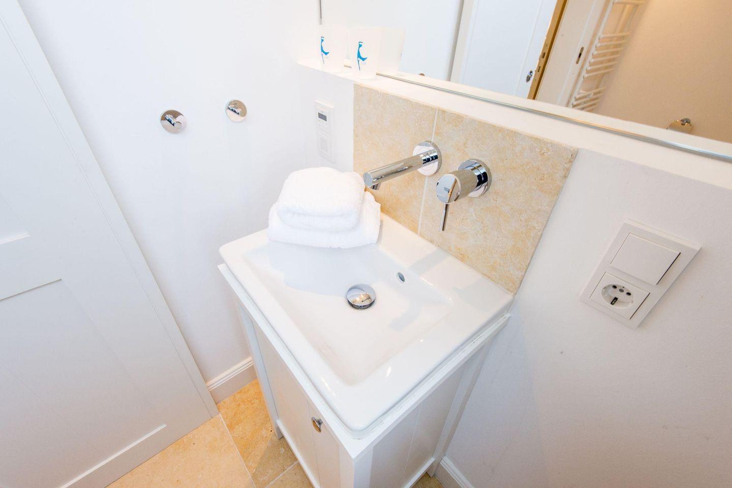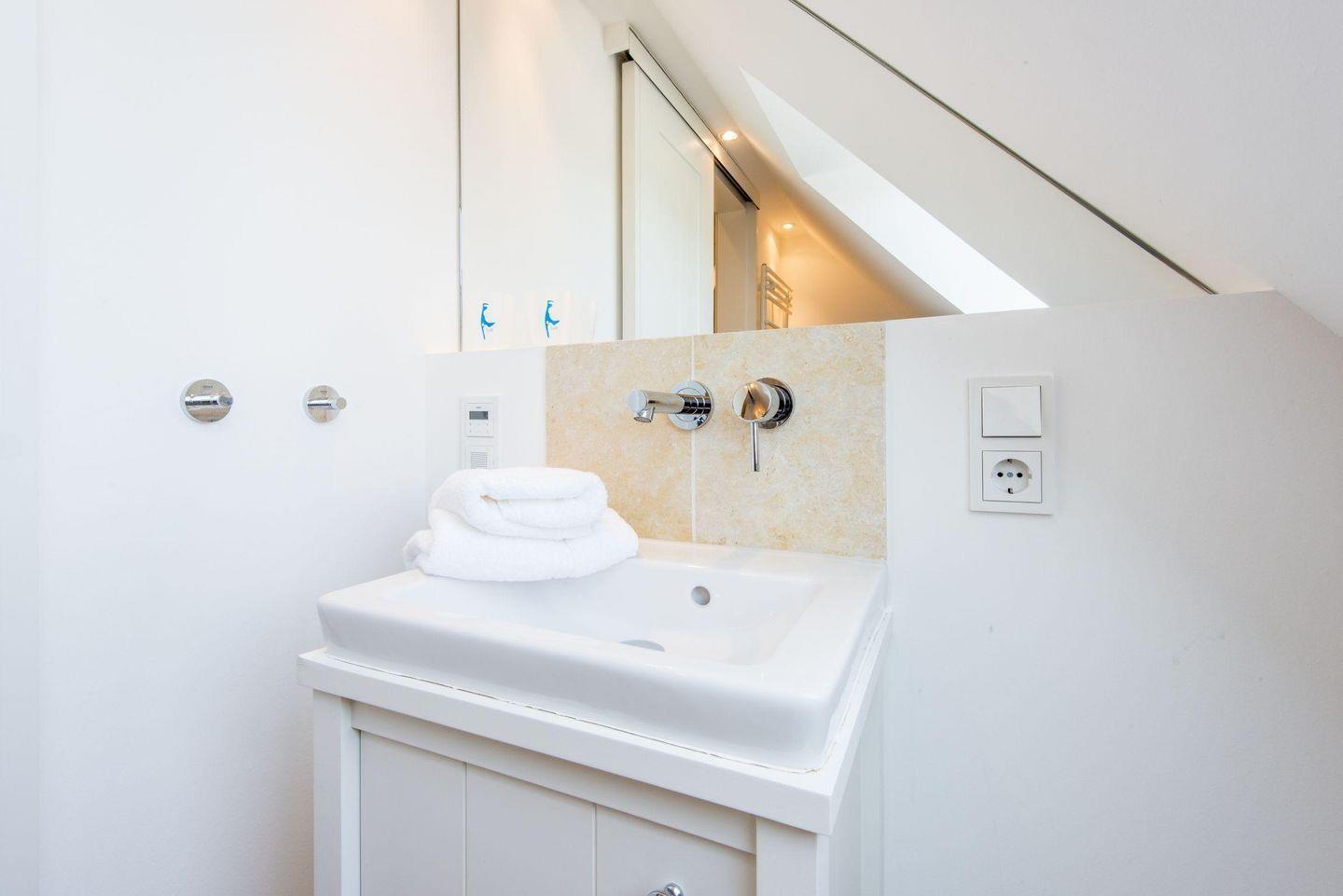 Das helle Badezimmer verfügt über eine ebenerdige Regendusche, WC, Handtuchwärmer und Tageslicht. Zusätzlich gibt es ein Gäste-WC mit Handtuchwärmer und Waschtrockner, was besonders für längere Aufenthalte praktisch ist.