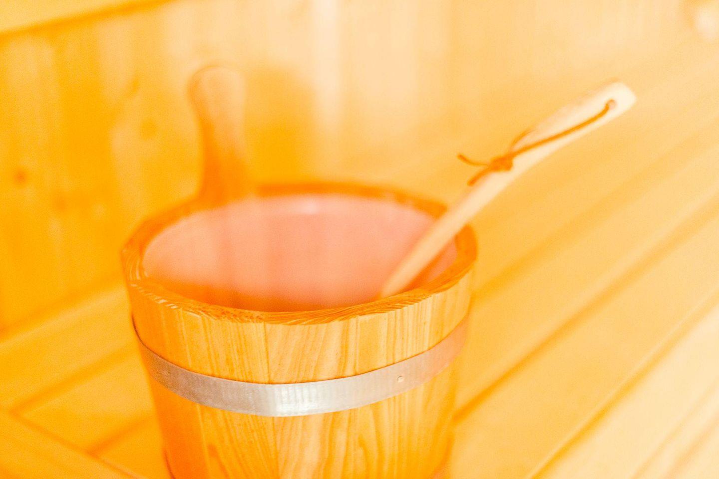 Das luxuriöse Badezimmer bietet eine Badewanne, eine ebenerdige Regendusche und eine Sauna für erholsame Stunden. Das Tageslicht sorgt für eine angenehme Atmosphäre, und ein separates Gäste-WC im Eingangsbereich rundet den Komfort ab. Eine Waschkammer mit Waschtrockner ist ebenfalls vorhanden.